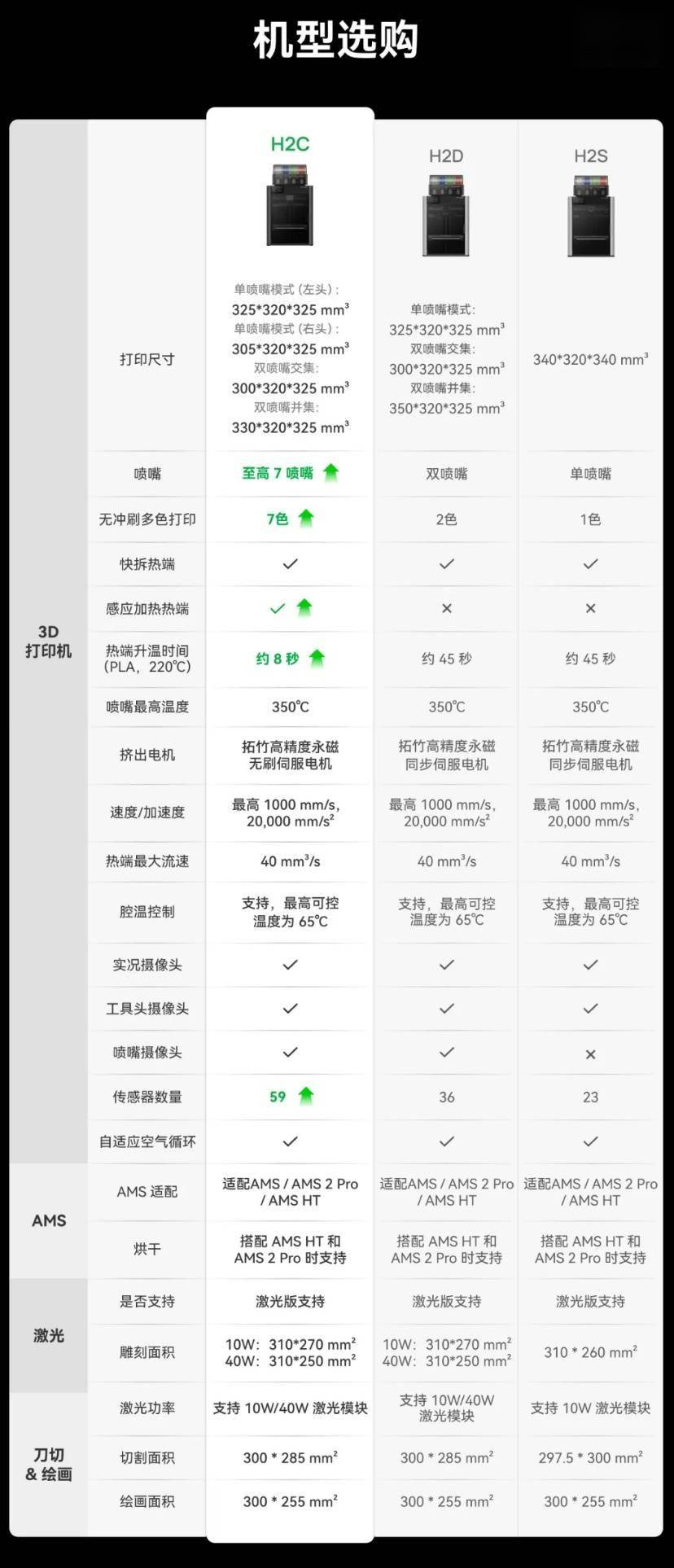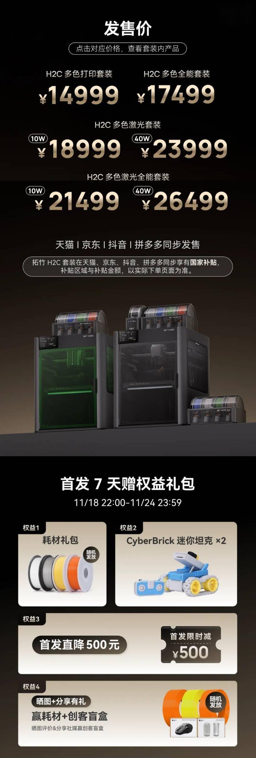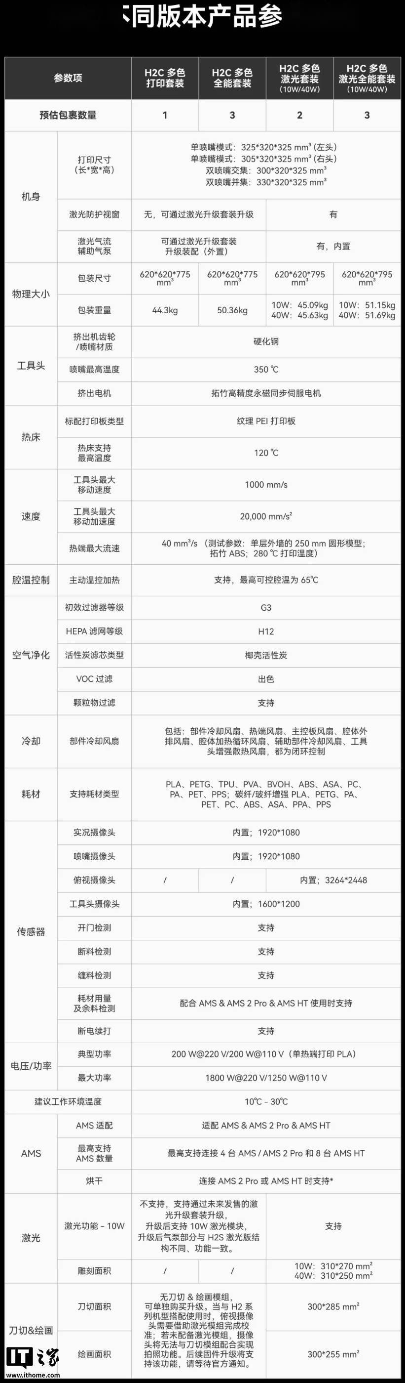 拓竹 H2C 京东首发可享 500 元现金减免,到手价 14499 元起,IT之家附拓竹 H2C 参数表如下: