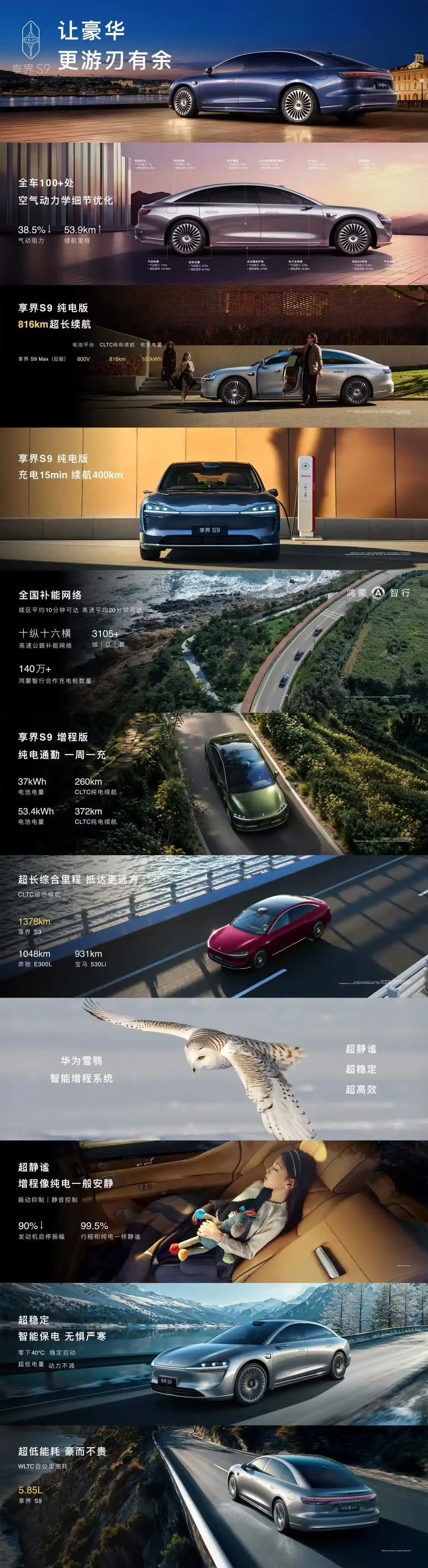 增程版:搭载华为雪鸮智能增程系统,CLTC 综合续航里程最高 1378km。