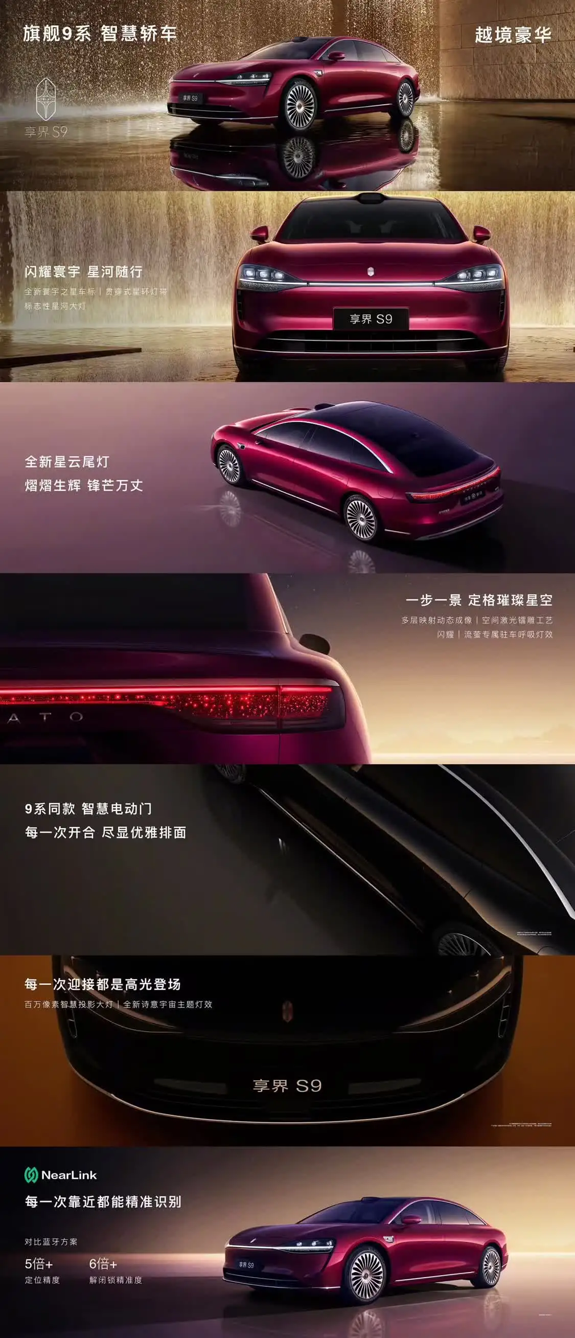 新款享界 S9 配备了全新“寰宇之星”车标,外观辅以贯穿式星环灯带、标志性星河大灯、星云尾灯点缀,增强优雅、豪华的格调;配备智慧电动门、百万像素智慧投影大灯,并有星闪技术加持,对比蓝牙钥匙方案定位精度提升 5 倍、解闭锁精准度提升 6 倍。