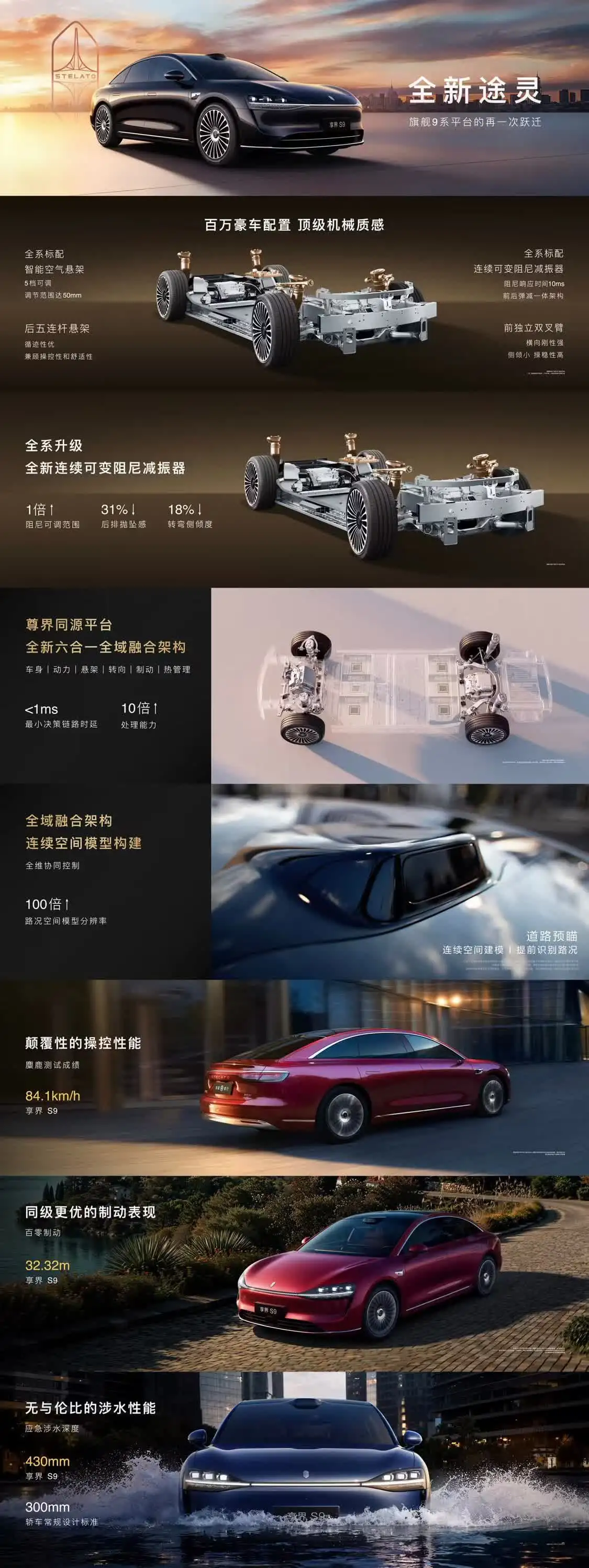 新款享界 S9 搭载全新华为途灵平台,全系标配智能空气悬架和全新连续可变阻尼减振器,升级尊界同源全新六合一全域融合架构,支持连续空间模型构建,实现全维协同控制。该车还拥有 430mm 的涉水性能,100km/h 到 0 制动距离 32.32m,麋鹿测试成绩为 84.1km/h。