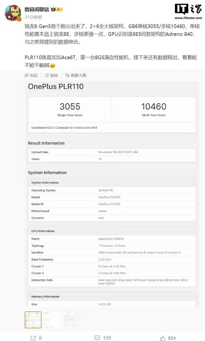 结合IT之家此前报道,高通现已官宣第五代骁龙 8(骁龙 8 Gen5)移动平台将于 11 月 26 日发布,根据博主此前爆料,骁龙 8G5 首个单核跑分 3055、多核跑分 10460,单核基本追上骁龙 8 至尊版(3161),多核超越骁龙 8 至尊版(9773)。