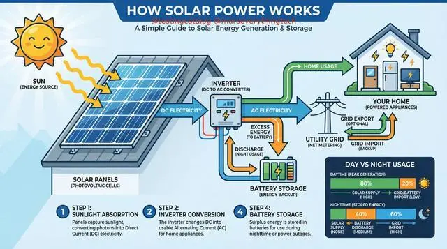 提示词:Create a wide infographic titled "How Solar Power Works" with a clean flat design. Include: a sun icon, solar panel diagram, arrows showing energy flow to a house and battery, four numbered steps with short captions, and a comparison bar chart of "Day vs Night usage". —ar 16:9