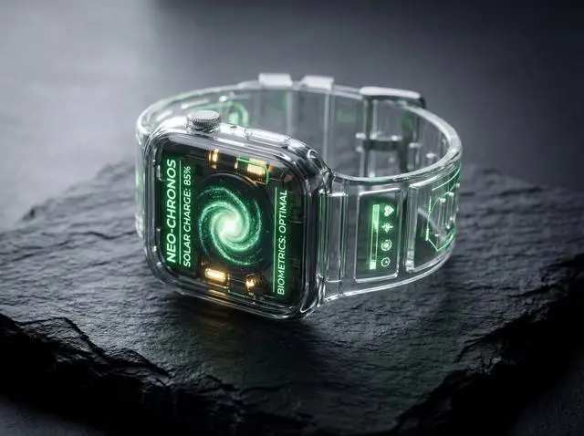 提示词:A professional studio product shot of a futuristic, transparent smart-watch resting on a piece of dark slate. The watch interface is glowing holographic green. Soft dramatic lighting, 8k resolution, macro photography style, shallow depth of field. —ar 4:3