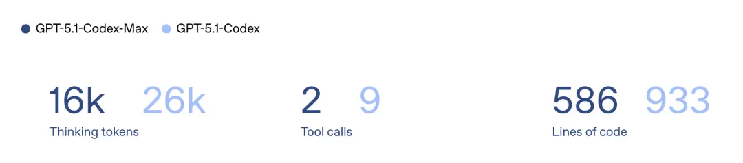 上:GPT-5.1-Codex-Max;下:GPT-5.1-Codex GPT-5.1-Codex-Max同样用了更少的token,和更精炼的代码完成了任务。