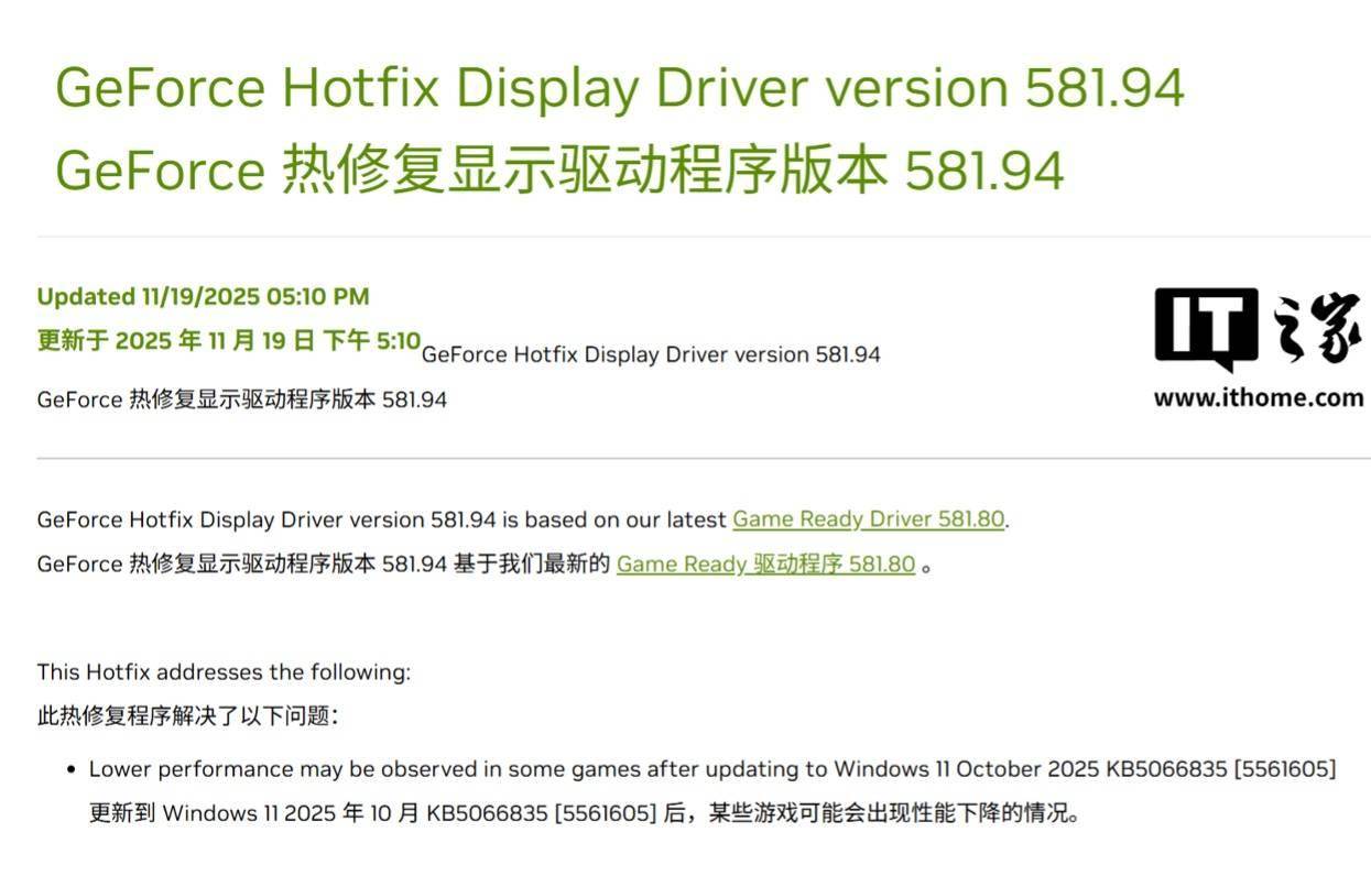 英伟达为彻底解决这一问题,已正式发布了版本号为 581.94 的 GeForce 显示驱动程序。官方表示,安装此版驱动可以修复由 Windows 更新引起的所有潜在性能问题。
