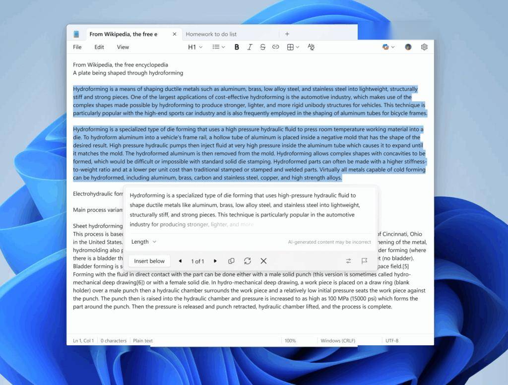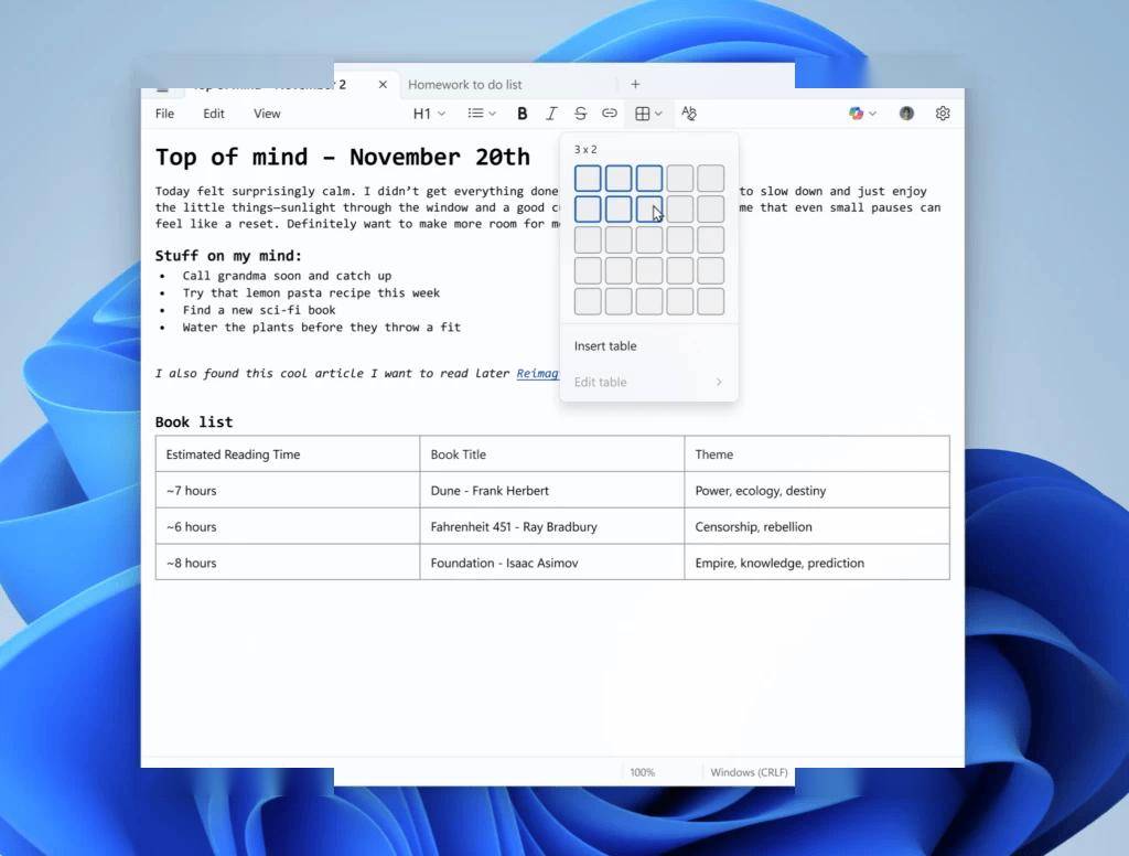 科技媒体 NeoWin 昨日(11 月 21 日)发布博文,报道称微软升级 Windows 11 内置的记事本应用,在最新版本 11.2510.6.0 中首次引入了表格功能。 这项更新旨在扩展记事本的轻量级格式化能力,让其不再局限于纯文本编辑。用户现在可以轻松地在文档中插入表格,从而更高效地结构化笔记和数据。 IT之家援引博文介绍,新版记事本提供了两种便捷的方式来创建表格。用户既可以通过格式化工具栏中新增的“表格”选项一键插入,也可以直接使用 Markdown 语法手动添加。 表格插入后,编辑操作也同样直观。用户只需通过右键菜单或工具栏顶部的“表格”菜单,即可快速执行添加或删除行、列等常用操作,满足基础的表格调整需求。 除了核心的表格功能外,本次更新还优化记事本内置的 AI 体验。微软为“撰写”、“重写”和“摘要”等 AI 工具引入了“流式响应”(streaming responses)机制。 这意味着 AI 在生成内容时,结果会像打字一样逐字逐句地实时呈现,用户无需等待完整响应生成完毕,即可提前预览并与之交互,提升了 AI 工具的响应速度和使用体验。 部分新功能存在一定的硬件和账户限制。“重写”功能的流式响应目前仅限于 Windows 11 AI+ PC 设备,此外,用户必须登录自己的微软账户,才能启用记事本中的所有 AI 驱动工具。 微软目前已开始邀请 Dev 和 Canary 频道的 Windows 预览体验成员推送记事本 11.2510.6.0 版本,预计将在未来几周内逐步覆盖其他预览频道,并最终向所有正式版用户开放。