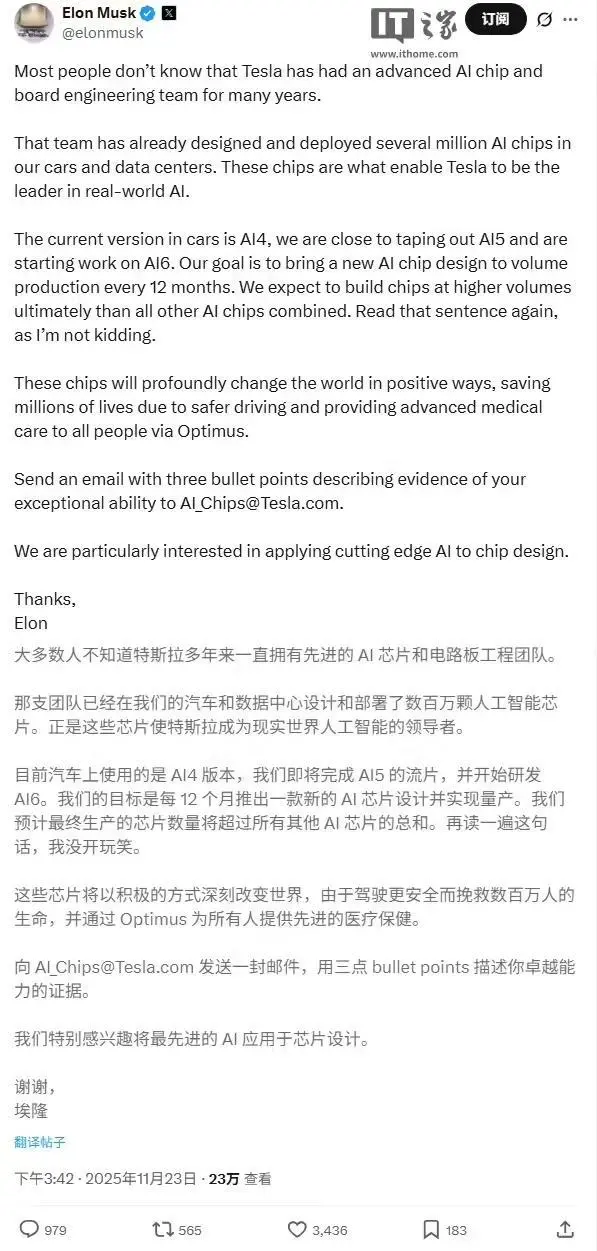 IT之家 11 月 23 日消息,特斯拉 CEO 埃隆・马斯克(Elon Musk)刚刚发布 X 文并置顶,首次系统性地介绍了特斯拉自研 AI 芯片团队的长期布局与发展目标。