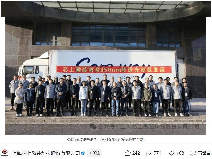 上海芯上微装科技股份有限公司(AMIES)昨日宣布:公司自主研发的首台 350nm 步进光刻机(AST6200)正式完成出厂调试与验收,启程发往客户现场。 芯上微装表示,这标志着我国在高端半导体光刻设备领域再次实现关键突破!这不仅是一次产品的交付,更是国产半导体装备向高端化、自主化迈进的重要里程碑。 据官方介绍,AST6200 光刻机是芯上微装基于多年光学系统设计、精密运动控制与半导体工艺理解积淀,倾力打造的高性能、高可靠性、全自主可控的步进式光刻设备,专为功率、射频、光电子及 Micro LED 等先进制造场景量身定制。 ▲ 芯上微装首台 350nm 步进光刻机(AST6200) 核心性能亮点 高分辨率成像满足先进工艺需求,搭载大数值孔径投影物镜,结合多种照明模式与可变光瞳技术,实现 350nm 高分辨率,满足当前主流化合物半导体芯片的光刻工艺要求。 高精度套刻配置高精度对准系统,实现正面套刻 80nm,背面套刻 500nm,确保多层图形精准套刻,提升器件良率。 高产率设计,显著降低拥有成本(COO): - 1.高照度 I-line 光源(IT之家注:波长 365nm,属于深紫外线 UVA 级别)