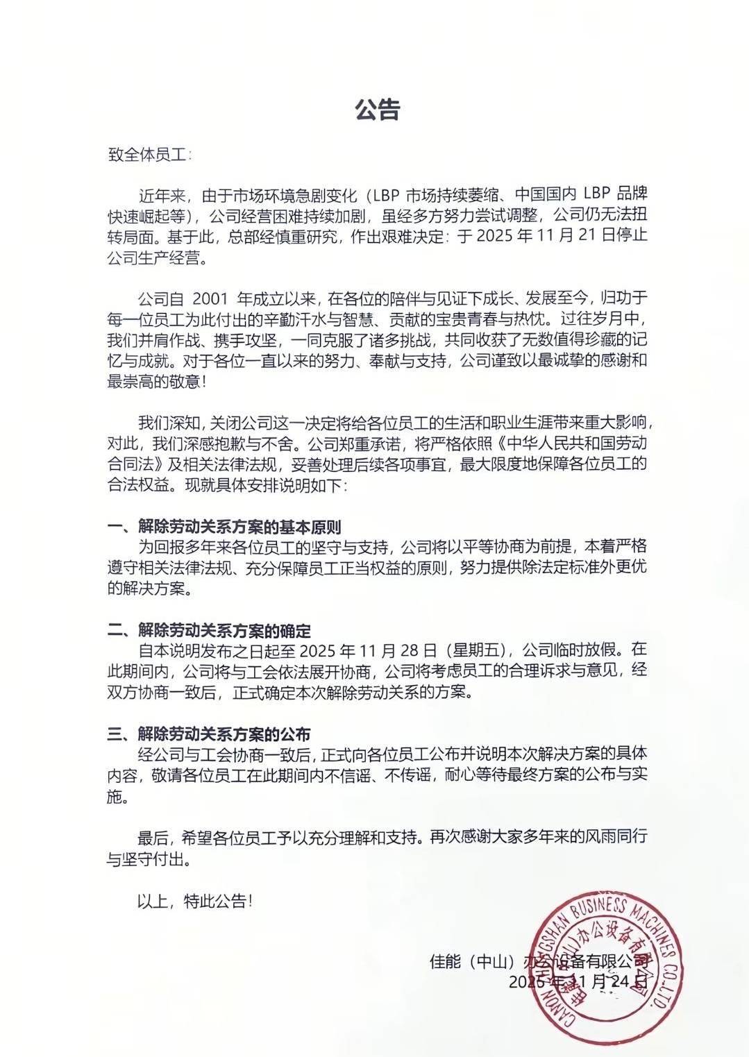 日企大厂佳能(中山)办公设备有限公司的一则公告今日在网上曝光,内容显示公司将停止生产经营并正式关闭。