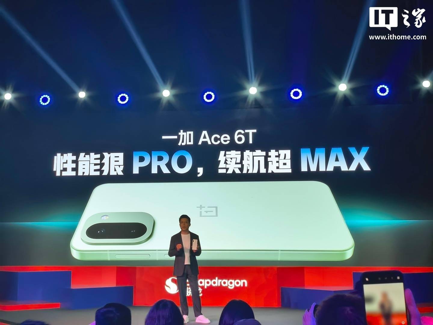 IT之家从发布会获悉,李杰还展示了一加 Ace 6T 的真机,该机拥有掠影绿、电光紫和闪速黑三色可选,全球首发第五代骁龙 8 芯片,配备 165Hz 高刷屏幕,标配 3D 超声波指纹,以及“8 开头电池 + 百瓦快充”。