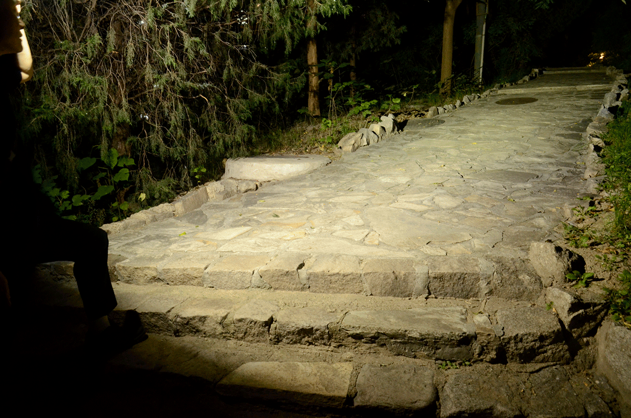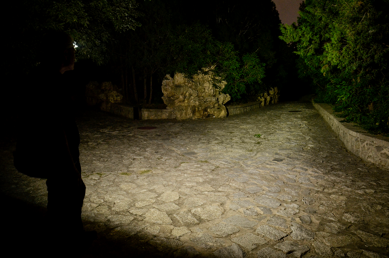 H4的聚光和泛光各有3个档位,而且有档位记忆功能,按一下对应开关将开启记忆档位,此后按住开关,就会按照:低亮15lm—中亮150lm—高亮300lm的顺序换挡,再次单击任一开关,关闭照明。下面动态图中增加了聚光+泛光全开的情况,便于对比照明效果。