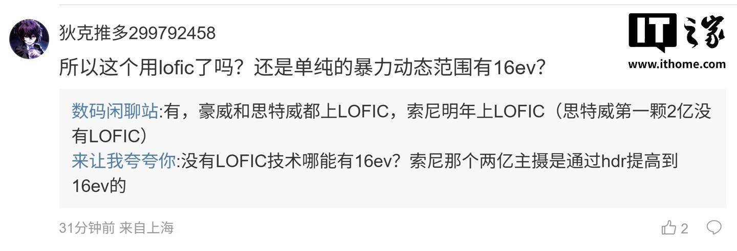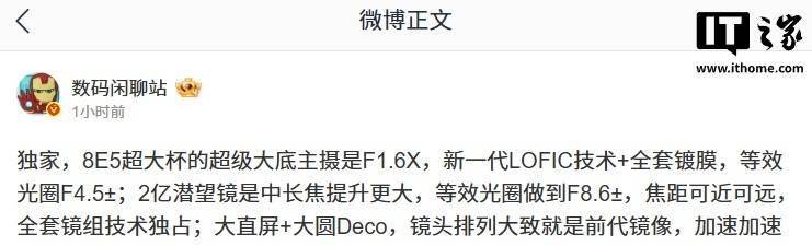 数码闲聊站 今天在微博透露,某厂骁龙 8 Elite Gen 5 超大杯新机主摄动态范围可达 100dB+。 博主表示,这台手机搭载的豪威 OV50X 传感器标称动态范围可达 16EV,加上尺寸的优势,进光量比较可观,同时该手机是这代骁龙 8 Elite Gen 5 超大杯机型中唯一有一英寸主摄的。 后续有用户在评论区询问:“今年至少比往年有看点,往年 1/1.3 和 1 英寸主摄差距太大,今年是 1 英寸和 1/1.2 的较量”,博主回复道:“别忘了还有 OV50R,这颗是 1/1.3"[狗头斜眼]”。 另一名用户则询问道:“所以这个用 lofic 了吗?还是单纯的暴力动态范围有 16ev?”,博主则回复道:“有,豪威和思特威都上 LOFIC,索尼明年上 LOFIC(思特威第一颗 2 亿没有 LOFIC)”。 结合博主文中暗示和评论区猜测,预计这台手机是小米 17 Ultra。 据IT之家此前援引博主消息,某厂的骁龙 8 Elite Gen 5 超大杯旗舰机搭载 f/1.6X 超级大底主摄,采用新一代 LOFIC 技术 + 全套镀膜,等效光圈 F4.5±;2 亿潜望镜是中长焦等效光圈做到 F8.6±,焦距可近可远,全套镜组技术独占,预计为小米 17 Ultra。