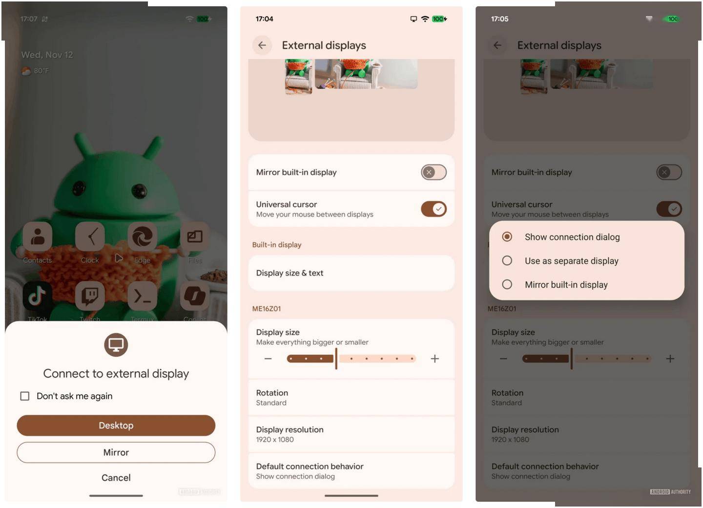 科技媒体 Android Authority 今天(11 月 27 日)发布博文,报道称谷歌正优化安卓系统的外接显示器连接体验。在未来的更新中,当手机连接到外部显示器后,系统将弹出一个对话框,支持用户选择“桌面模式”或“屏幕镜像”。 部分 Pixel 手机在升级到安卓 16 的季度版本后,获得了“桌面模式”(Desktop Mode)功能,可以将手机界面投射为桌面环境,但切换过程较为繁琐。 而在未来安卓更新中,谷歌计划引入全新的连接对话框。当用户将手机连接到外部显示器后,系统会自动弹出提示,提供“桌面模式”和“屏幕镜像”两个选项。 桌面模式适合连接键鼠进行高效办公,而屏幕镜像则方便用户通过手机直接操控,在大屏幕上观看内容。这个对话框彻底改变了过去需要深入设置菜单才能切换模式的复杂流程。 未来更新还将引入个性化记忆功能。在弹出的对话框中,系统提供了一个“不再询问”的复选框。勾选后,安卓系统会记住用户为这台特定显示器选择的连接模式。 这意味着,当用户再次连接同一台显示器后,系统将自动启用你偏好的模式,无需重复选择。用户后续也可以通过“设置 > 已连接的设备 > 外部显示器”来管理这些默认设置。 该功能模仿了 Windows 等桌面操作系统早已成熟的多屏管理逻辑,允许用户为不同显示设备设定不同的默认行为。目前,这项新功能已在最新的安卓 Canary 2511 版本中实装,预计将很快进入 Beta 测试阶段,最早可能在即将发布的安卓 16 QPR3 Beta 版中与用户见面。