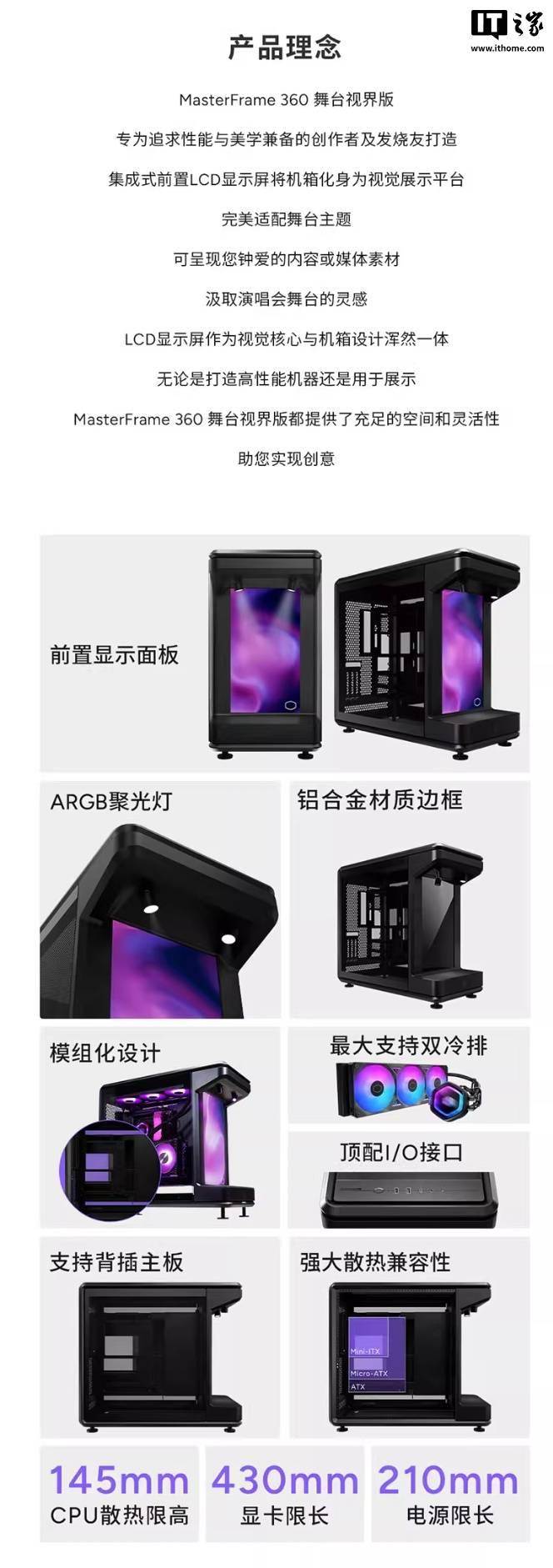 酷冷至尊 MF360 机箱现已上市,前面板拥有一块独特的手办展示区,可供玩家展示自己心爱之物,整体基于铝合金框架打造,支持背插主板,首发售价 1999 元起。