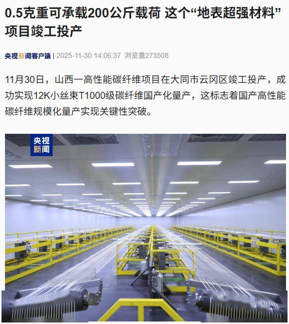 据央视新闻报道,今日,山西一高性能碳纤维项目在大同市云冈区竣工投产,成功实现12K 小丝束 T1000 级碳纤维国产化量产,这标志着国产高性能碳纤维规模化量产实现关键性突破。