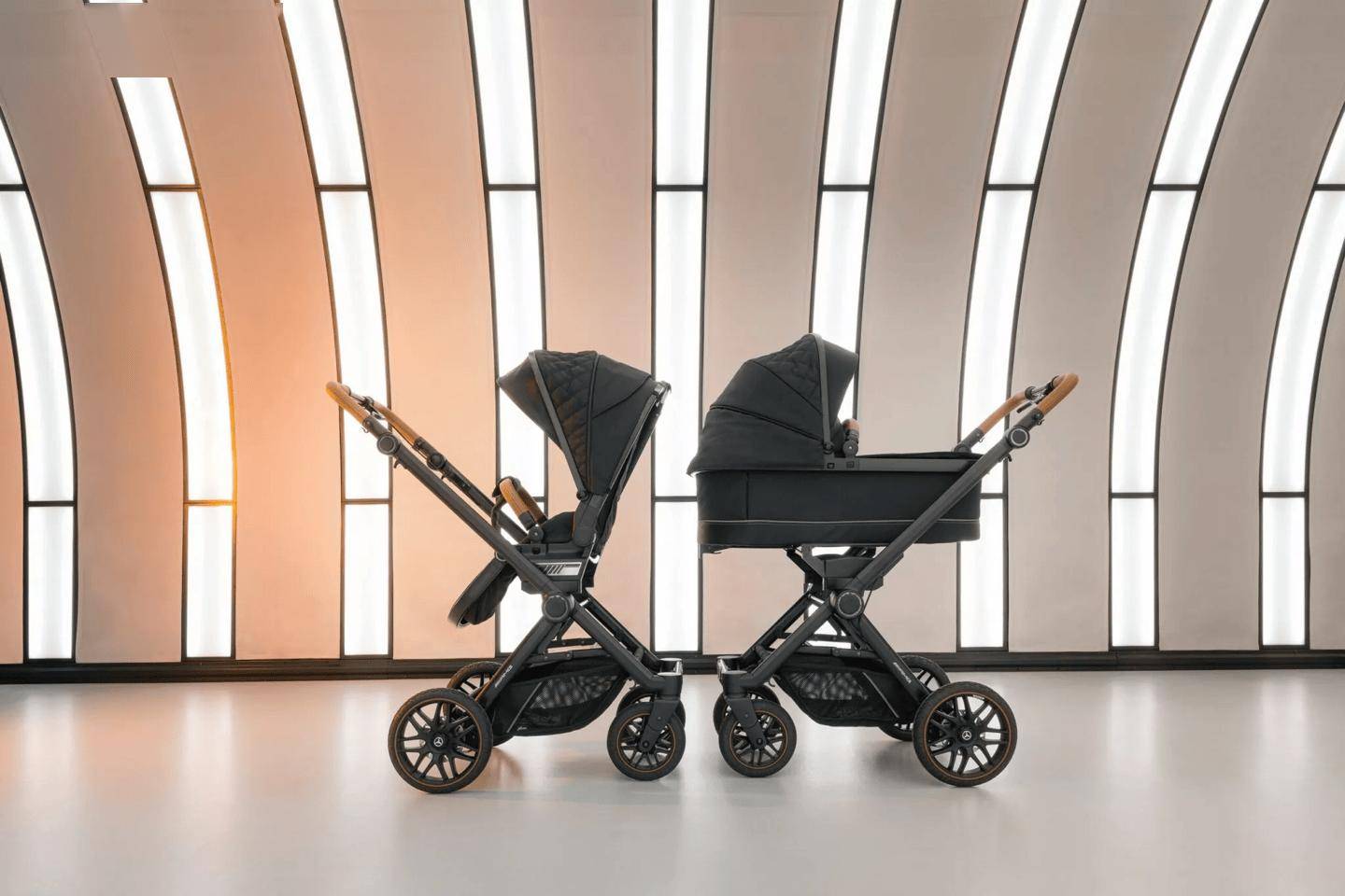 梅赛德斯及梅赛德斯-AMG 推出的全部四款推车均配备可调节悬挂系统,并附带一款名为 Bag2Go 的配件包,可便捷地卡扣在推杆上。追求极致奢华体验的父母甚至还可额外订购专用推车手套,以在寒冷天气中保持双手温暖。