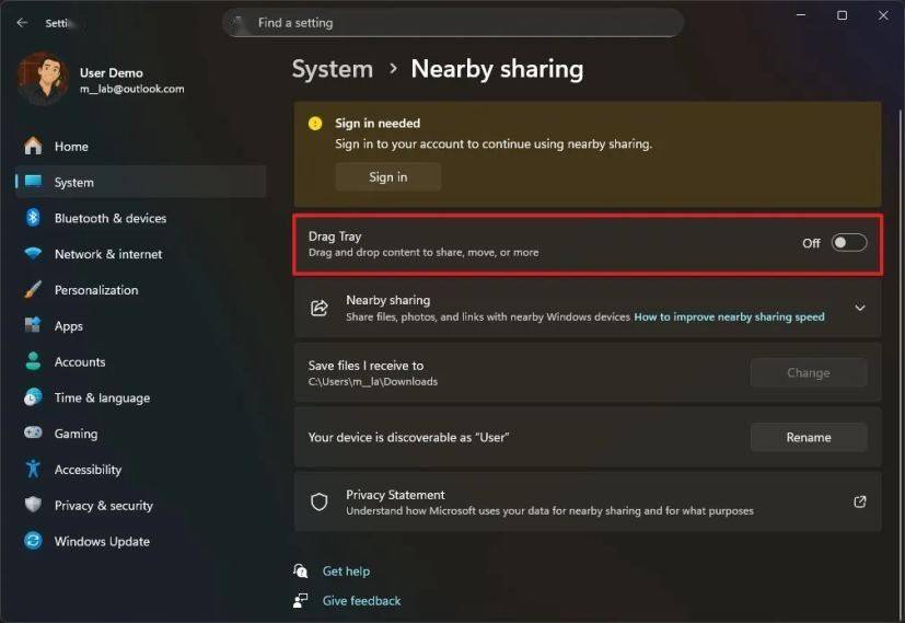 针对此前引发争议的“拖拽托盘”(Drag Tray)功能,微软听取了用户反馈,在“设置 > 系统 > 就近共享”中新增了一个官方开关。