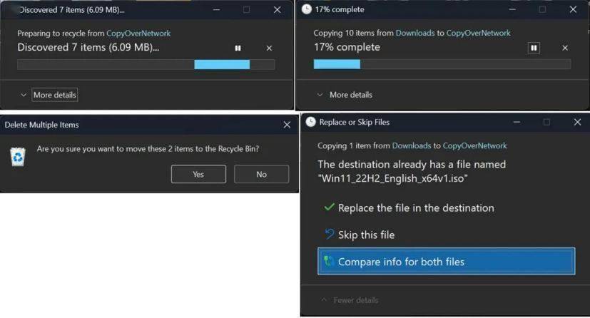对于深色模式用户而言,本次更新解决了文件资源管理器中长期存在的视觉割裂问题。微软重新设计了复制、移动、确认及删除等对话框的 UI,让其能正确跟随系统深色主题,消除了以往操作时突然出现的白色弹窗。IT之家附上相关图片如下:
