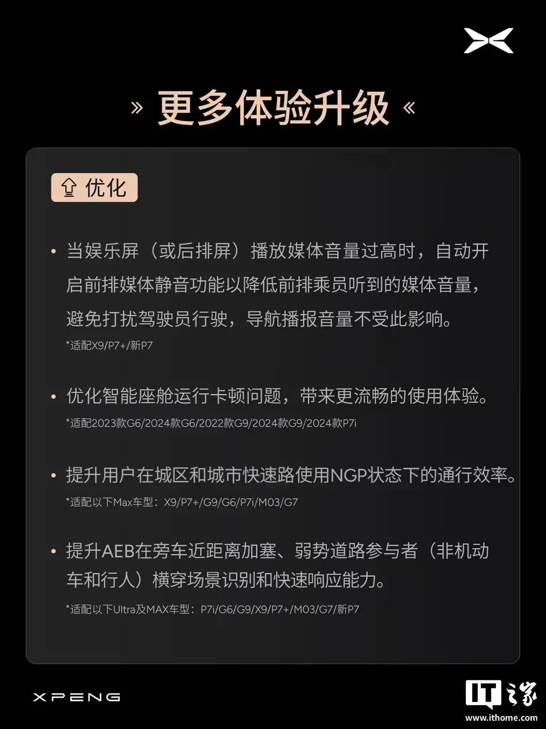 优化智能座舱运行卡顿问题,带来更流畅的使用体验。适配 2023 款 G6 / 2024 款 G6 / 2022 款 G9 / 2024 款 G9 / 2024 款 P7i。