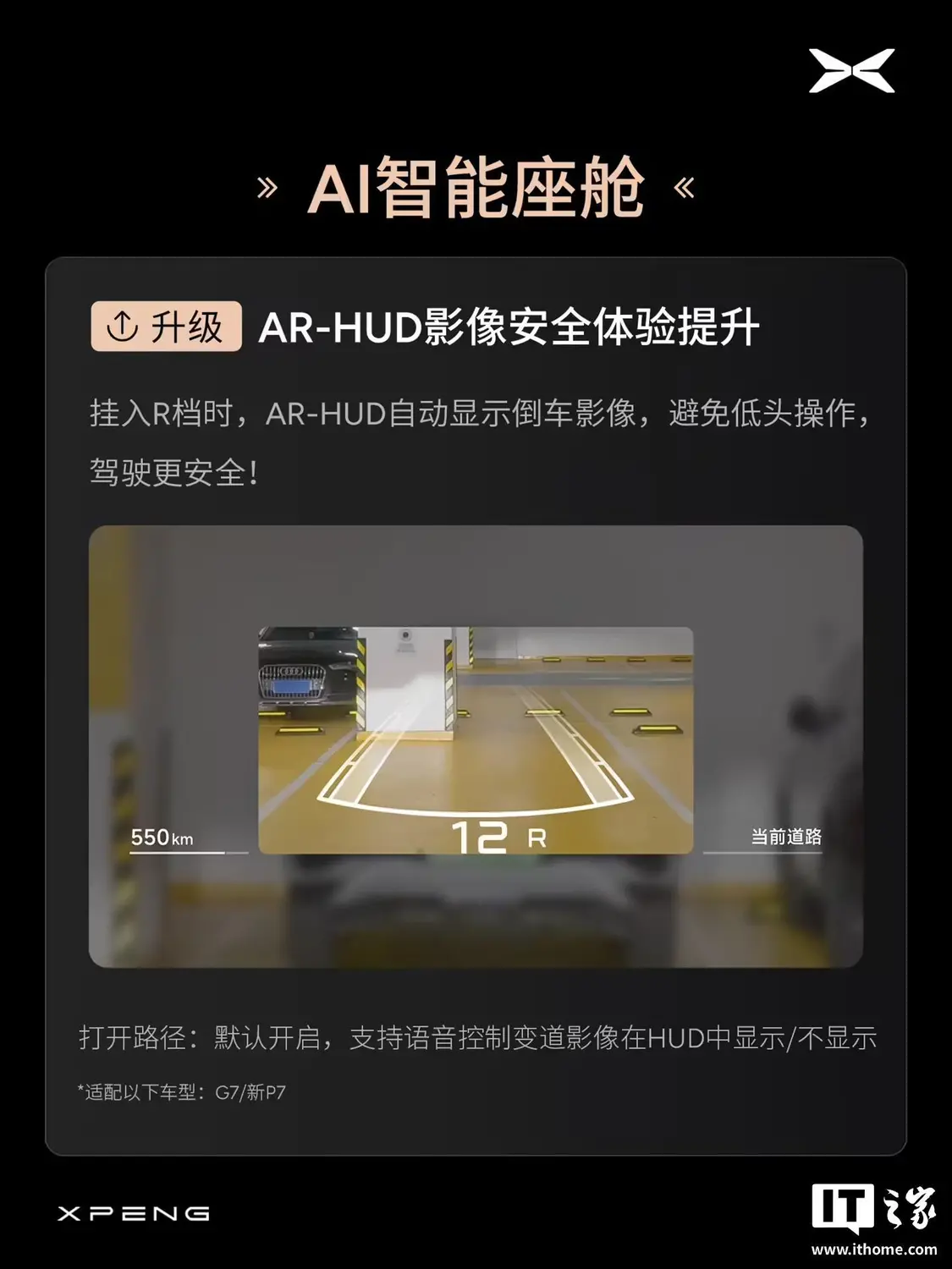 AR-HUD 影像安全体验提升:挂入 R 档时,AR-HUD 自动显示倒车影像,避免低头操作,驾驶更安全。打开路径:默认开启,支持语音控制变道影像在 HUD 中显示 / 不显示。适配以下车型:G7 / 新 P7。