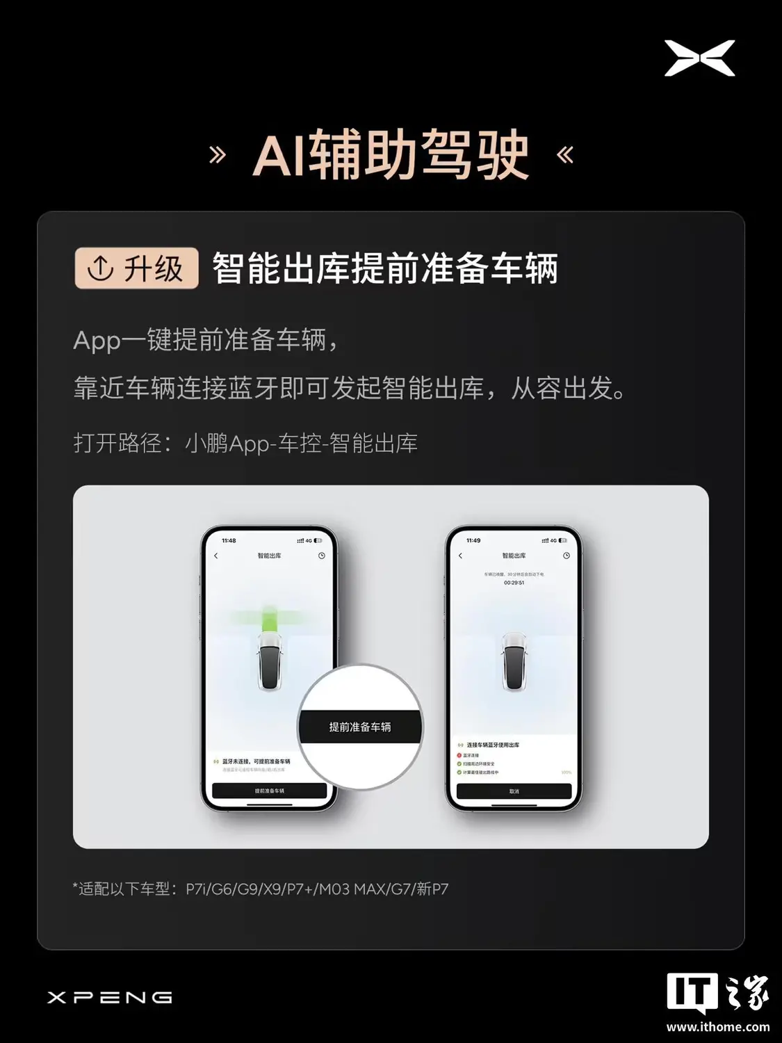 升级智能出库提前准备车辆:App 一键提前准备车辆,靠近车辆连接蓝牙即可发起智能出库,从容出发。打开路径:小鹏 App-车控-智能出库。