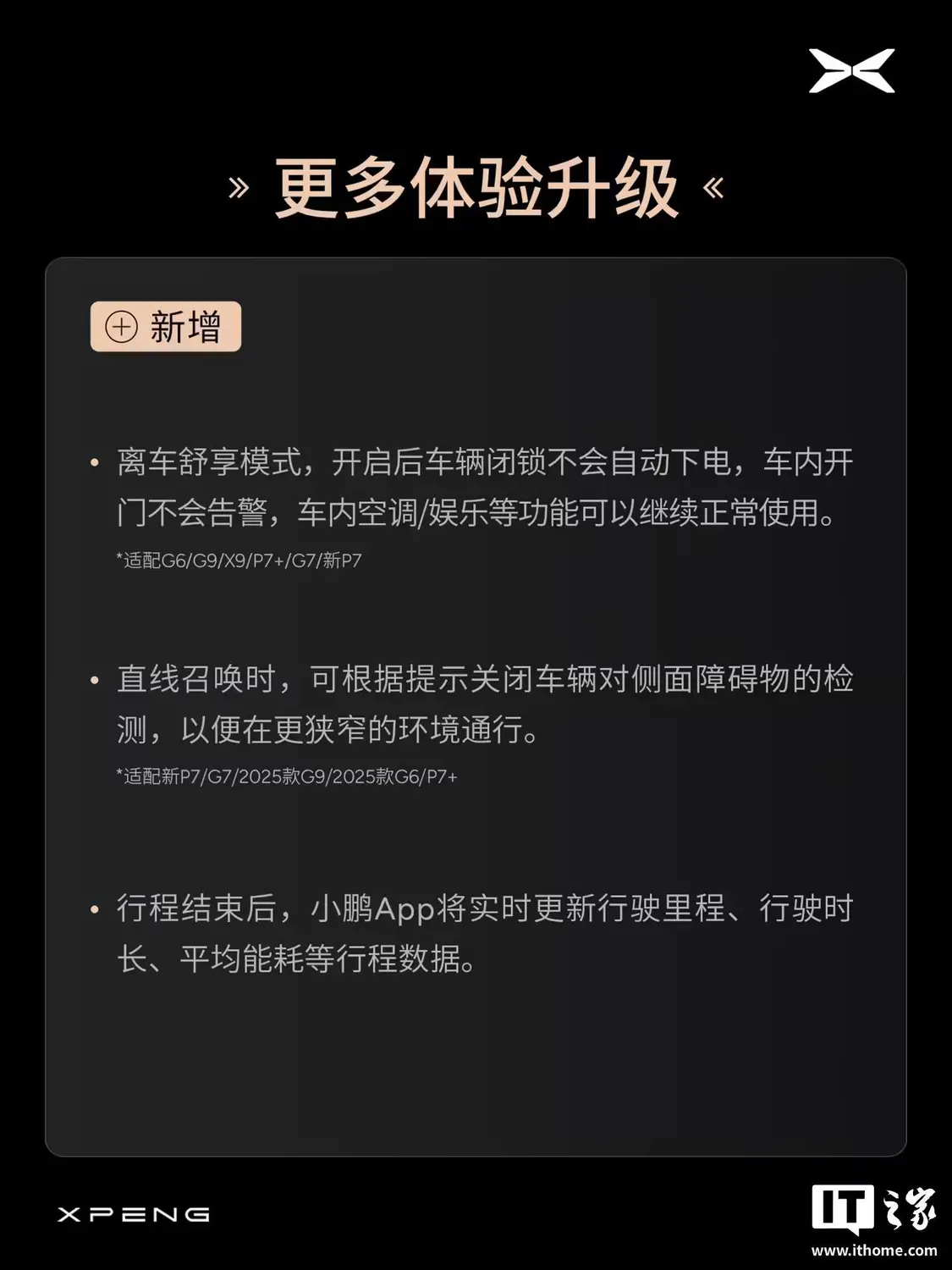新增离车舒享模式,开启后车辆闭锁不会自动下电,车内开门不会告警,车内空调 / 娱乐等功能可以继续正常使用。适配 G6 / G9 / X9 / P7+ / G7 / 新 P7