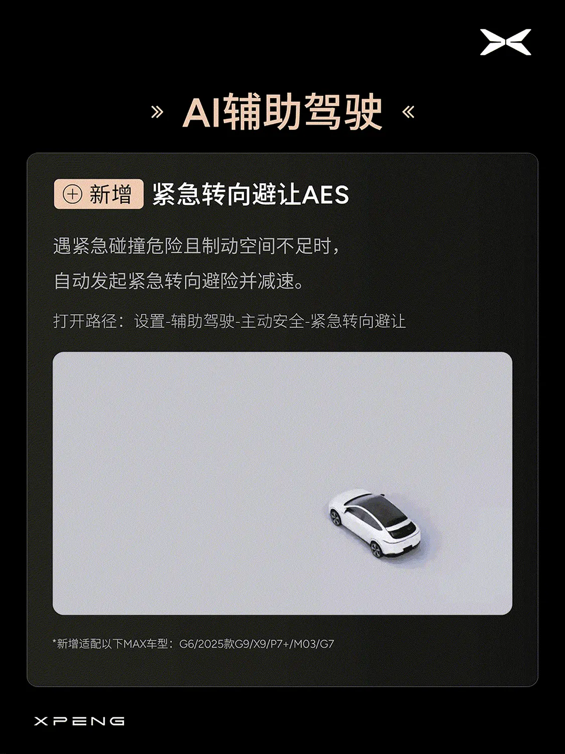 提升 AEB 在旁车近距离加塞、弱势道路参与者(非机动车和行人)横穿场景识别和快速响应能力。适配以下 Ultra 及 MAX 车型:P7i / G6 / G9 / X9 / P7+ / M03 / G7 / 新 P7。