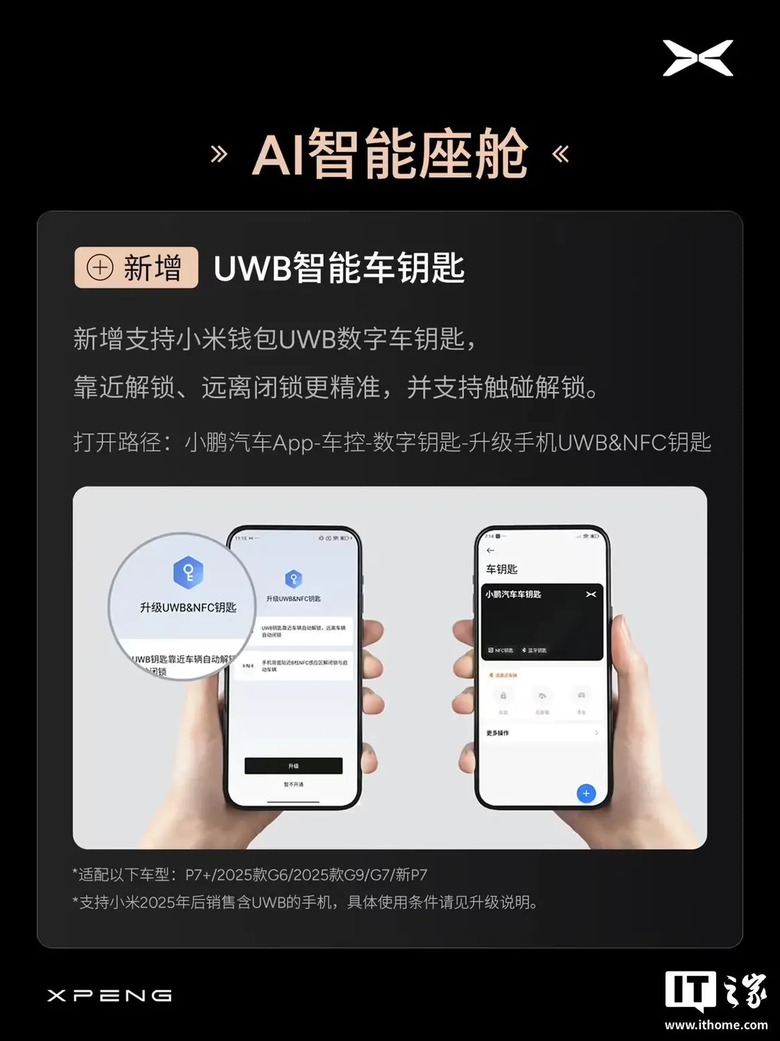 新增 UWB 智能车钥匙:新增支持小米钱包 UWB 数字车钥匙,靠近解锁、远离闭锁更精准,并支持触碰解锁。打开路径:小鹏汽车 App-车控-数字钥匙-升级手机 UWB & NFC 钥匙。适配以下车型:P7+ / 2025 款 G6 / 2025 款 G9 / G7 / 新 P7。支持小米 2025 年后销售含 UWB 的手机,具体使用条件请见升级说明。
