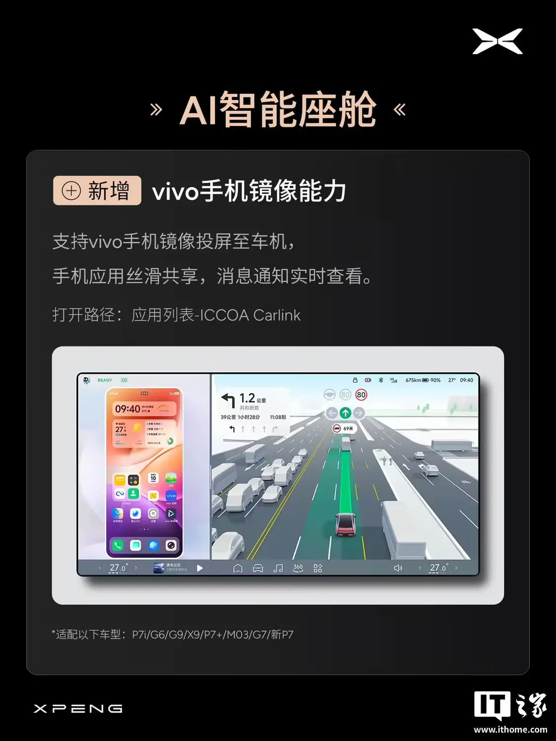 IT之家 12 月 3 日消息,小鹏汽车官方今日宣布,小鹏 AI 天玑 XOS 5.8.5 系统版本开启全量推送,新增车位到车位焕新版、vivo 手机镜像等功能。
