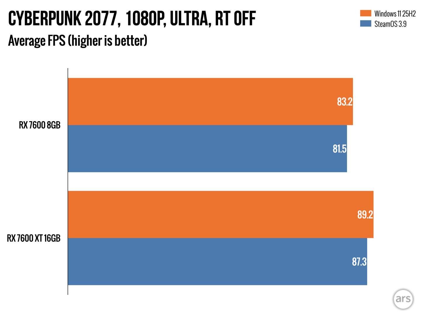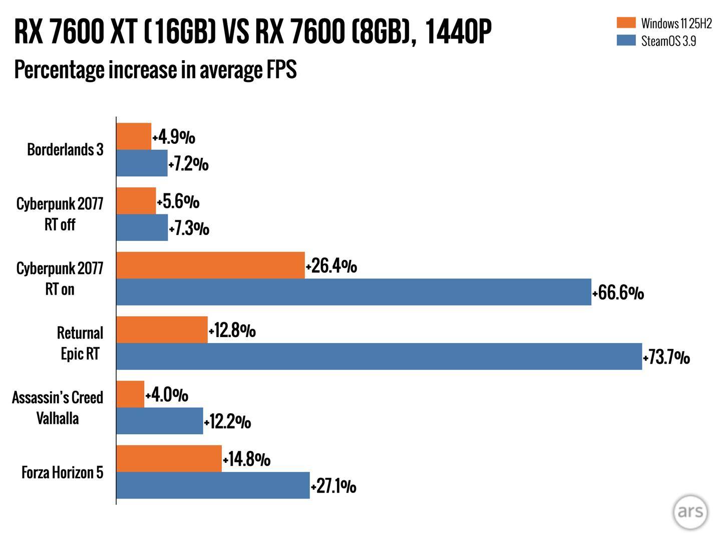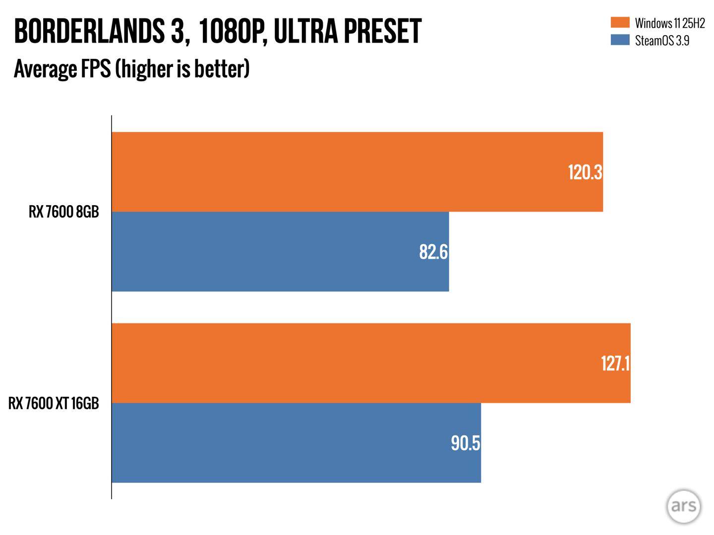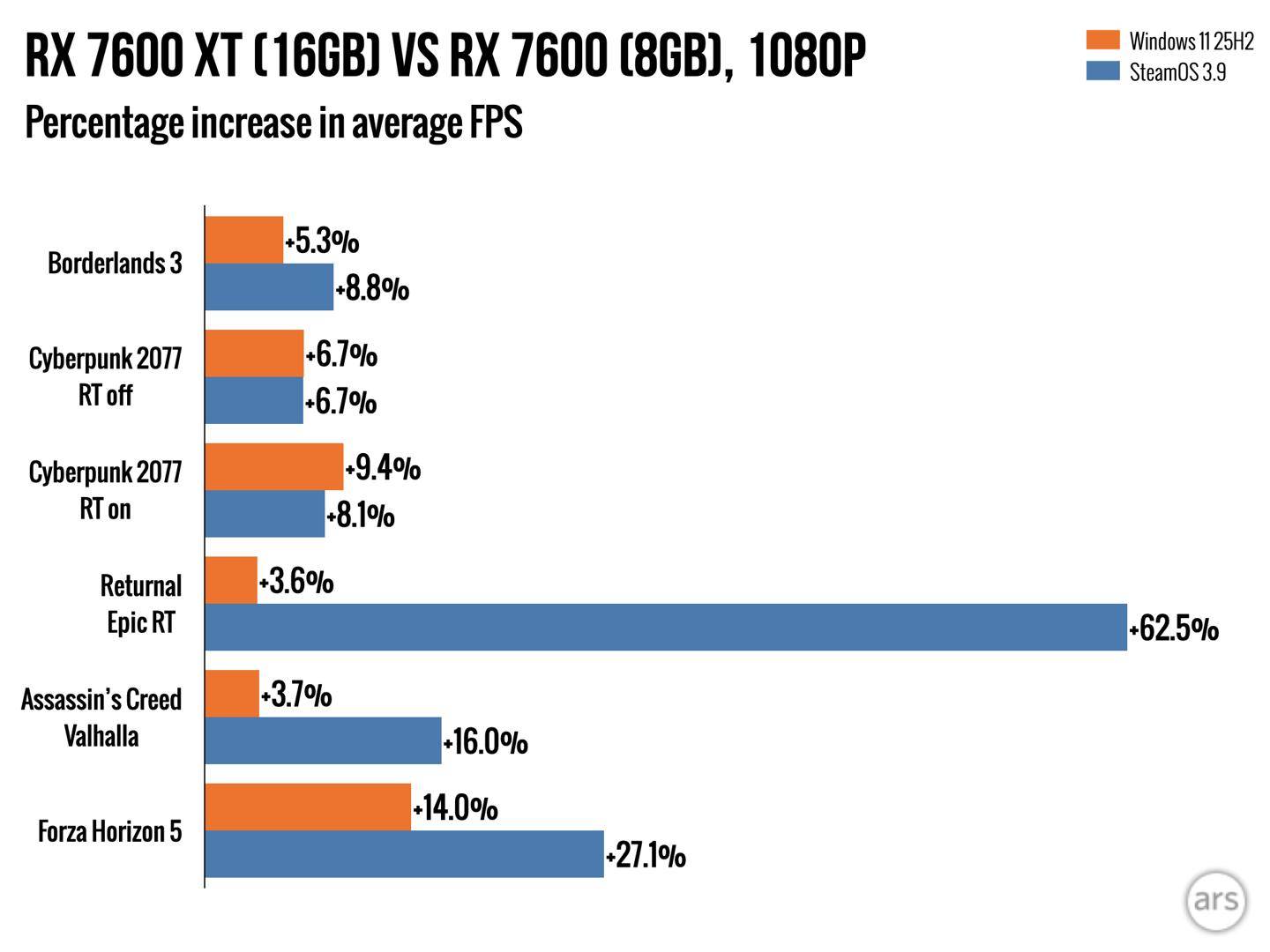 为了验证这一问题,Ars Technica 使用与 Steam Machine 硬件配置相近的 AMD Radeon RX 7600(8GB 显存)和 RX 7600 XT(16GB 显存)在 SteamOS 和 Windows 11 上进行了对比测试。