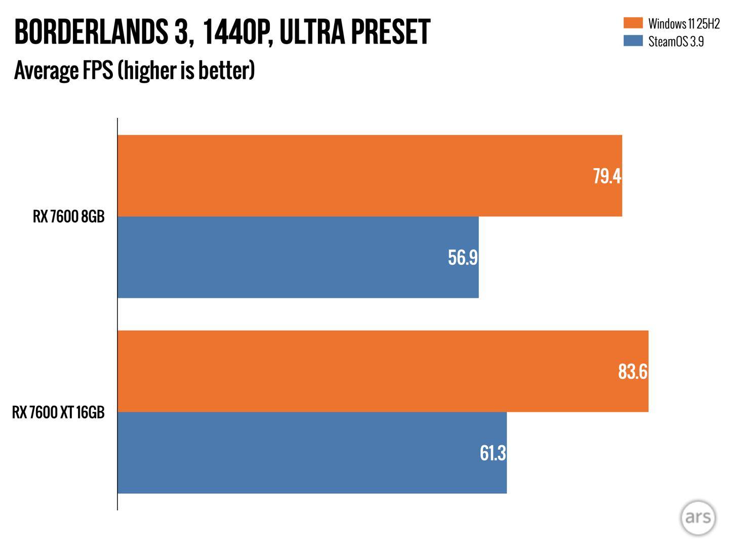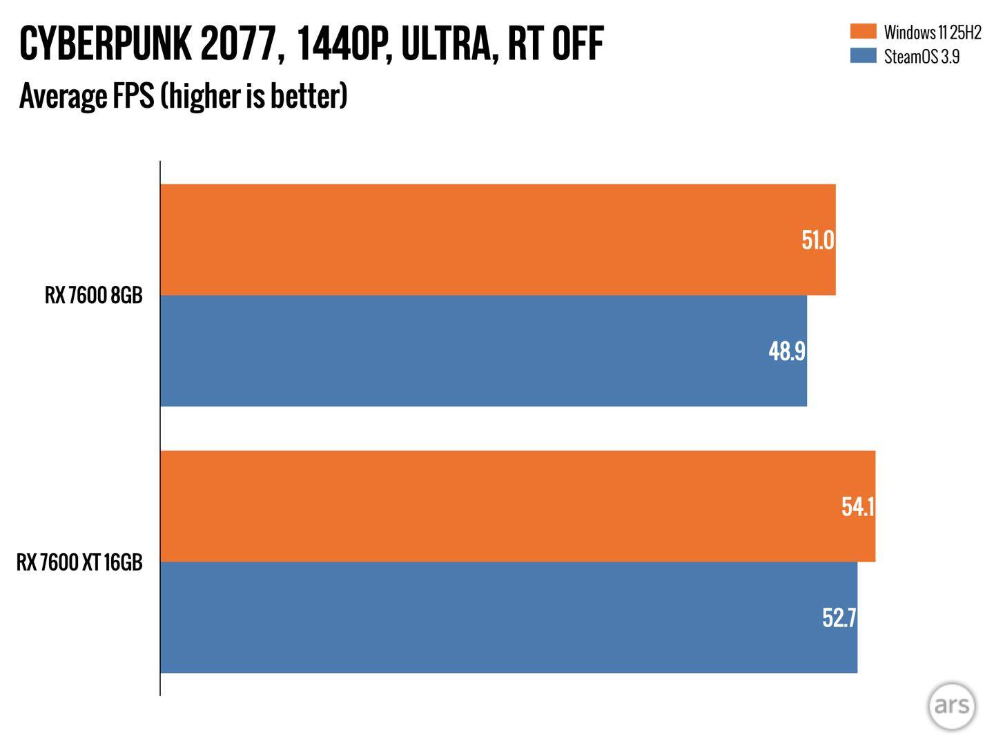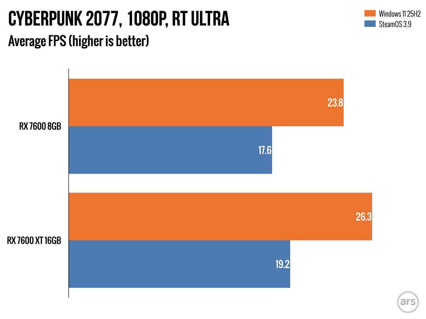 为了验证这一问题,Ars Technica 使用与 Steam Machine 硬件配置相近的 AMD Radeon RX 7600(8GB 显存)和 RX 7600 XT(16GB 显存)在 SteamOS 和 Windows 11 上进行了对比测试。
