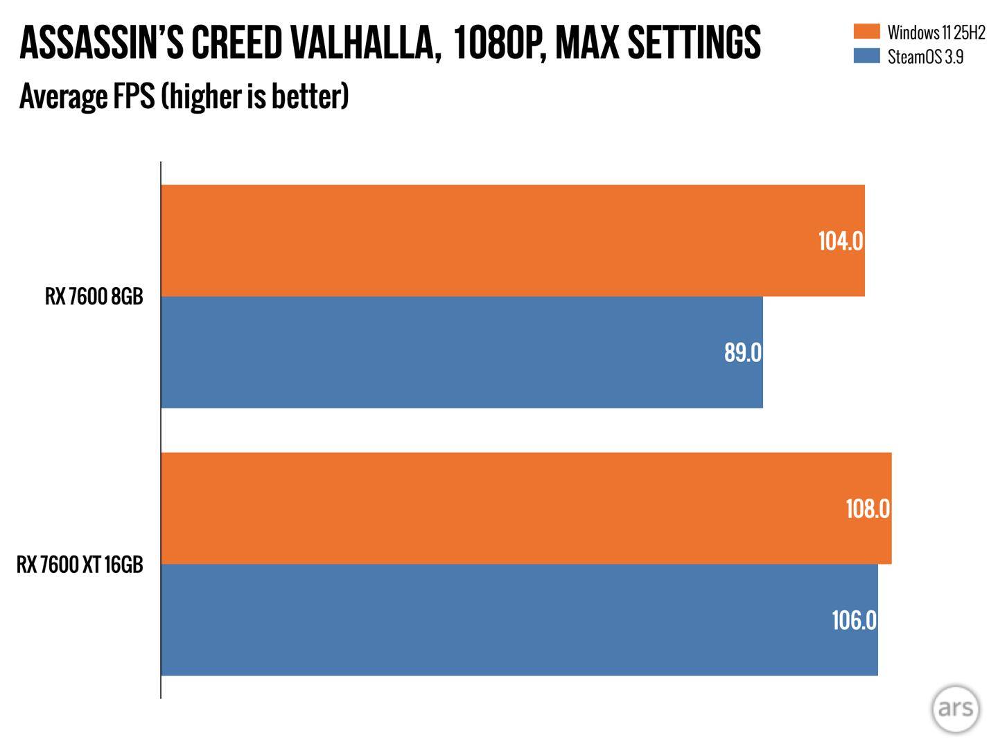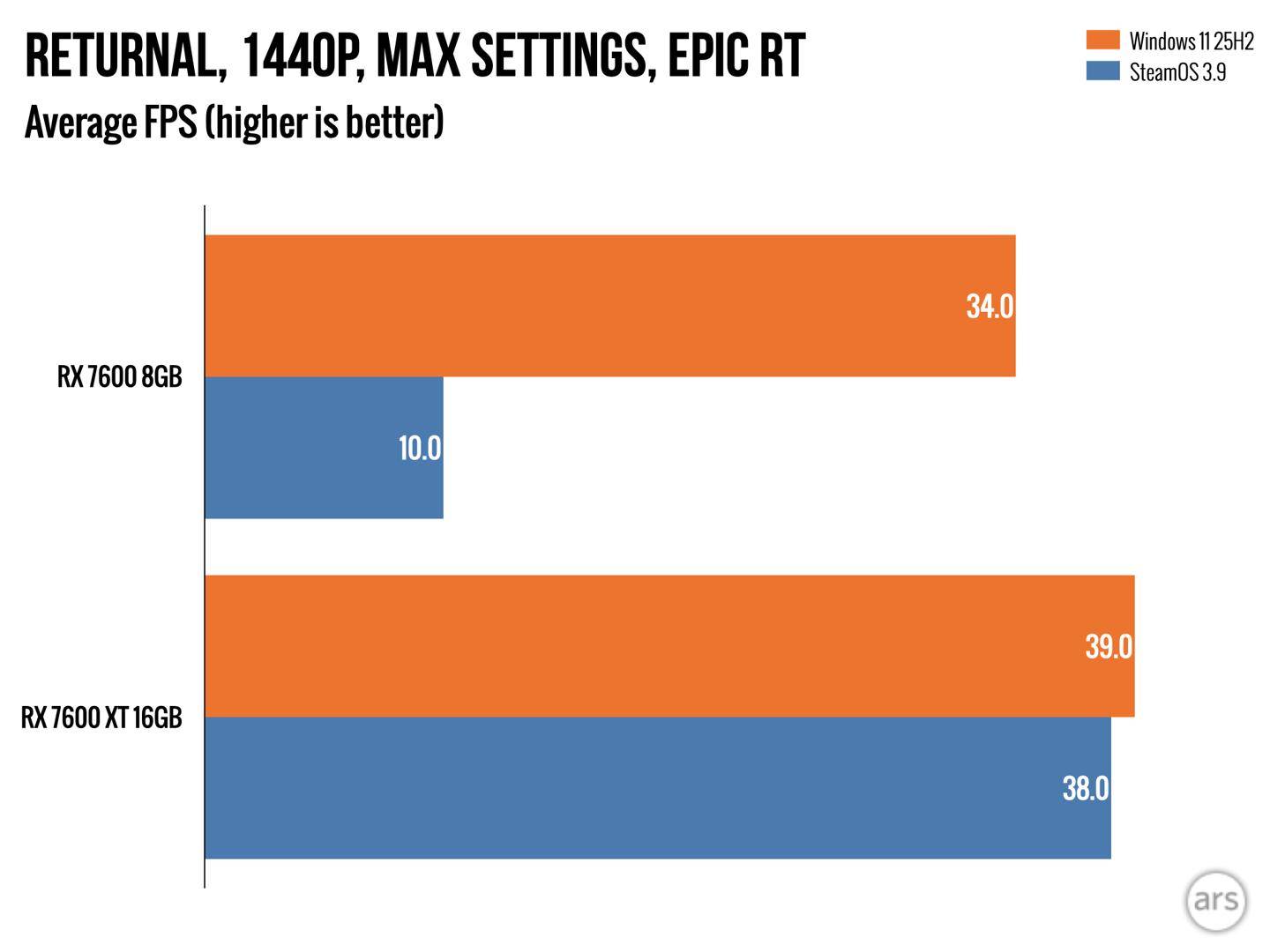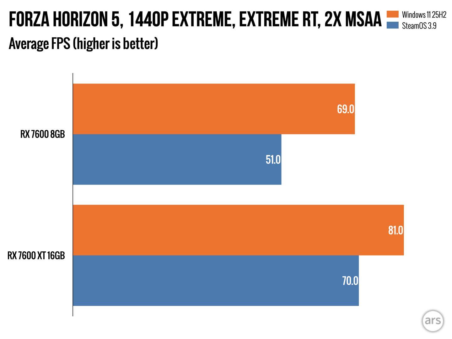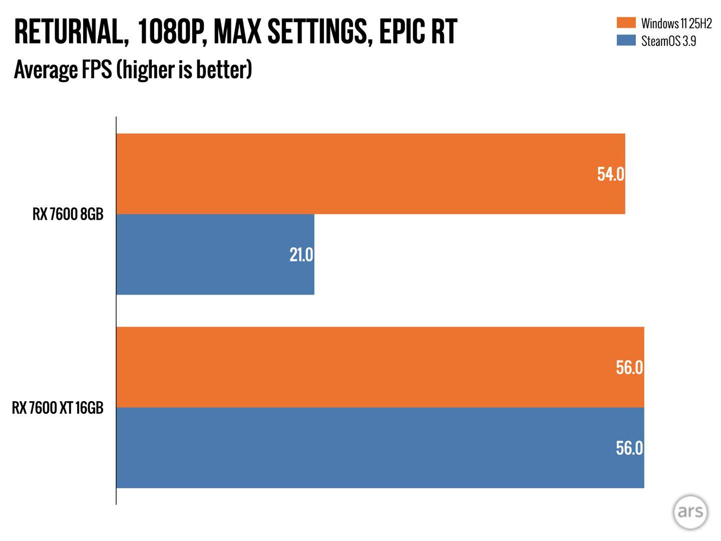 为了验证这一问题,Ars Technica 使用与 Steam Machine 硬件配置相近的 AMD Radeon RX 7600(8GB 显存)和 RX 7600 XT(16GB 显存)在 SteamOS 和 Windows 11 上进行了对比测试。