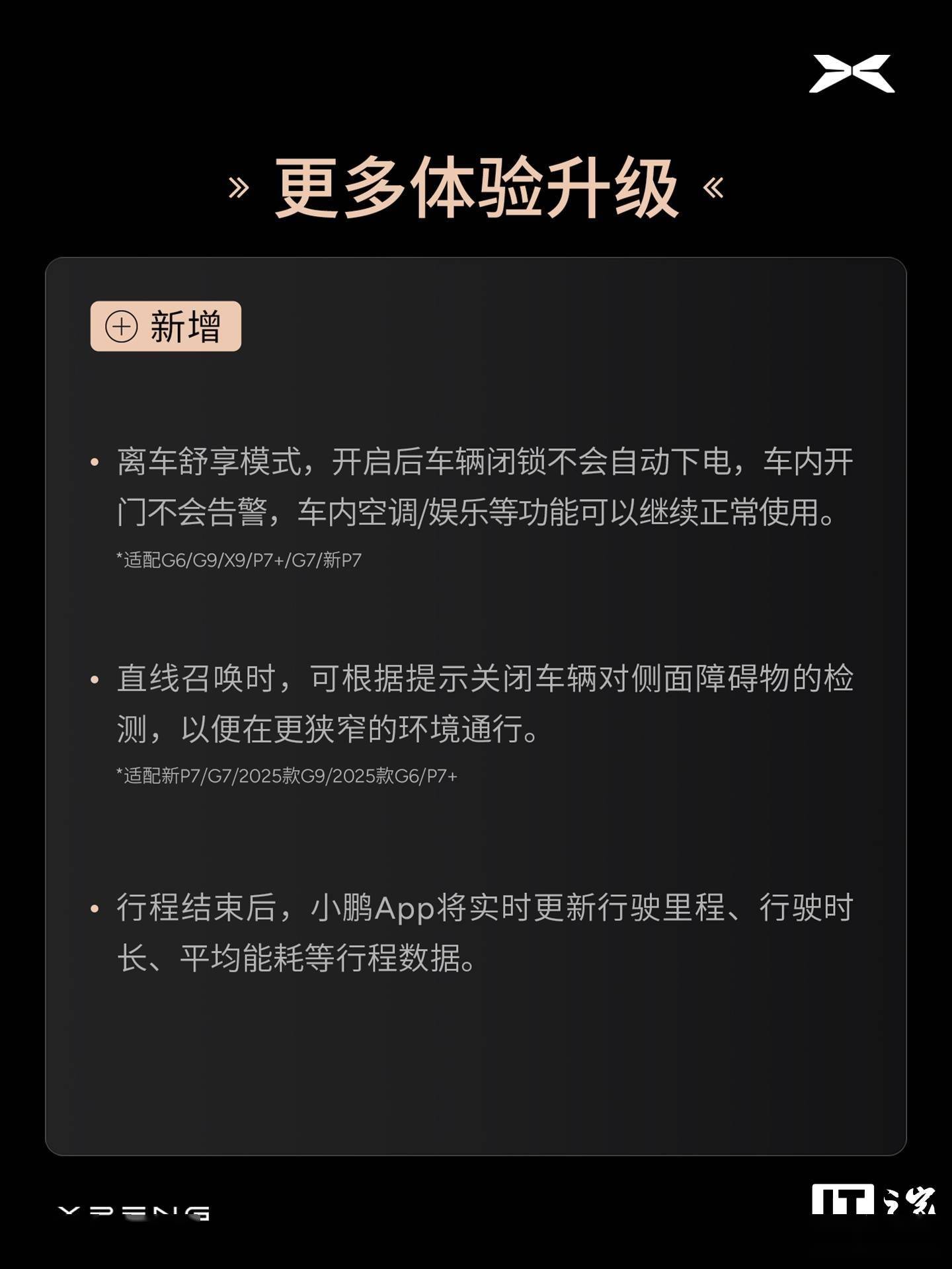 - 新增离车舒享模式,开启后车辆闭锁不会自动下电,车内开门不会告警,车内空调 / 娱乐等功能可以继续正常使用。适配 G6 / G9 / X9 / P7+ / G7 / 新 P7