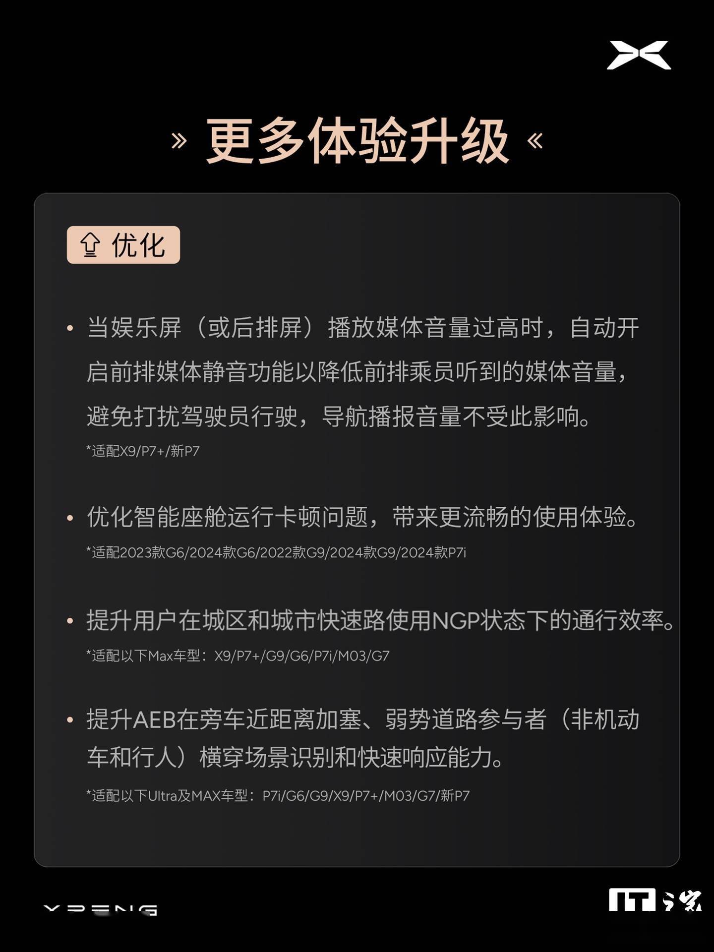 - 提升用户在城区和城市快速路使用 NGP 状态下的通行效率。适配以下 Max 车型:X9 / P7+ / G9 / G6 / P7i / M03 / G7。