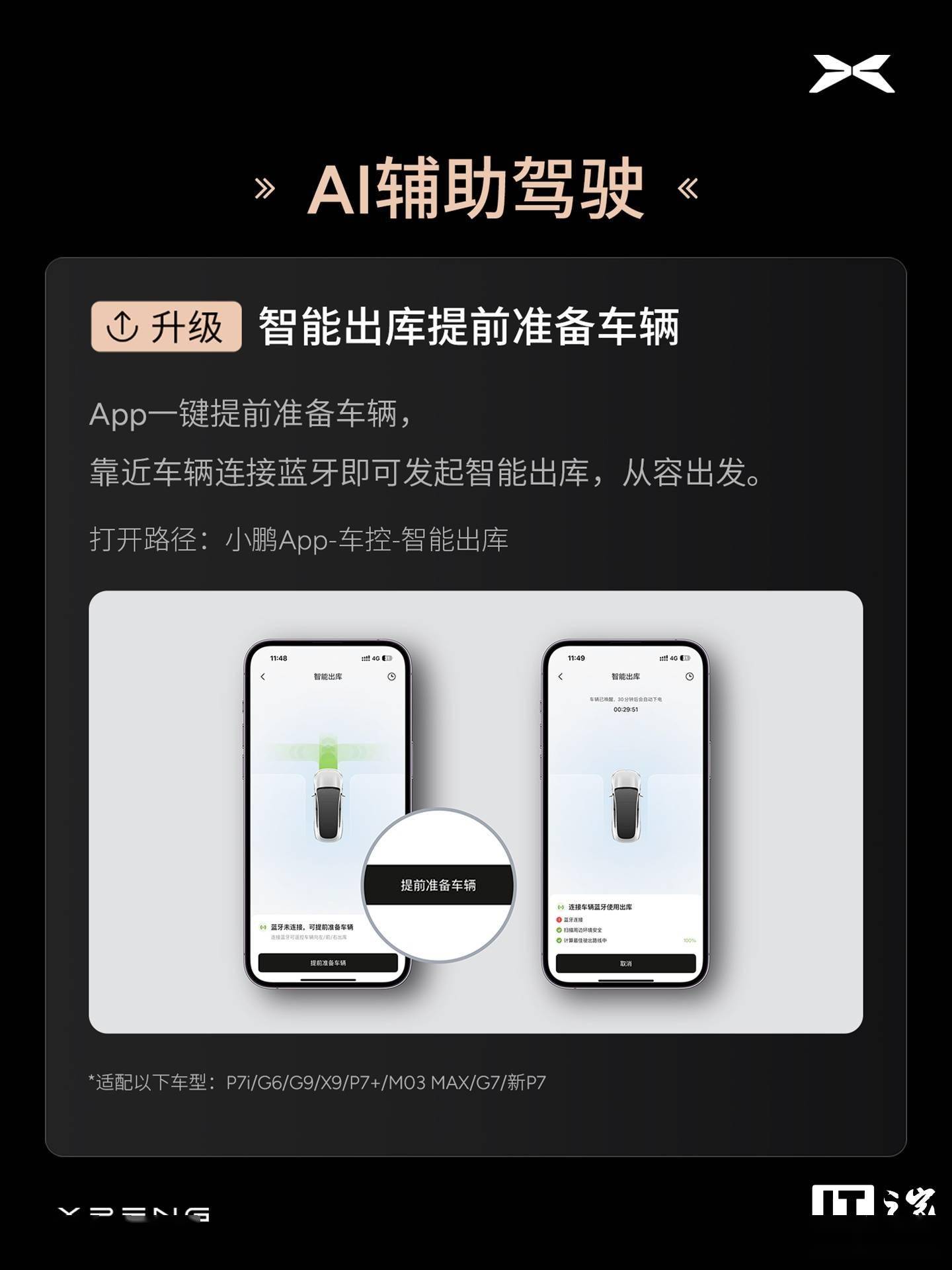 - 升级智能出库提前准备车辆:App 一键提前准备车辆,靠近车辆连接蓝牙即可发起智能出库,从容出发。打开路径:小鹏 App-车控-智能出库。