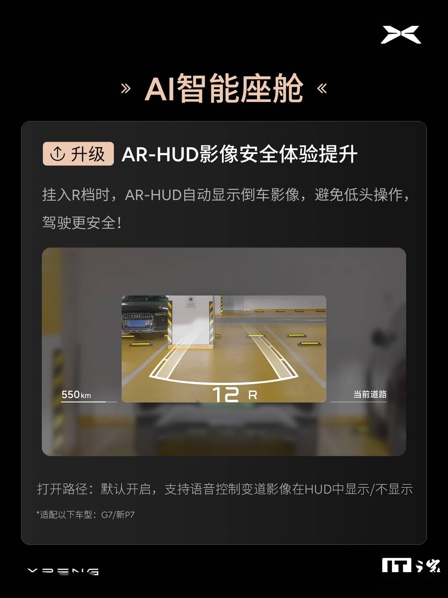 - AR-HUD 影像安全体验提升:挂入 R 档时,AR-HUD 自动显示倒车影像,避免低头操作,驾驶更安全。打开路径:默认开启,支持语音控制变道影像在 HUD 中显示 / 不显示。适配以下车型:G7 / 新 P7。