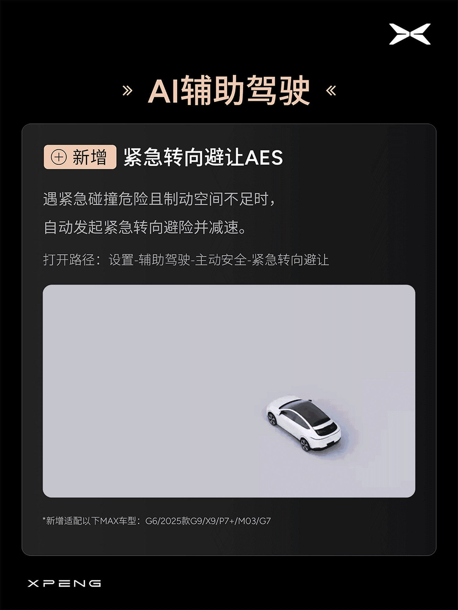 - 提升 AEB 在旁车近距离加塞、弱势道路参与者(非机动车和行人)横穿场景识别和快速响应能力。适配以下 Ultra 及 MAX 车型:P7i / G6 / G9 / X9 / P7+ / M03 / G7 / 新 P7。