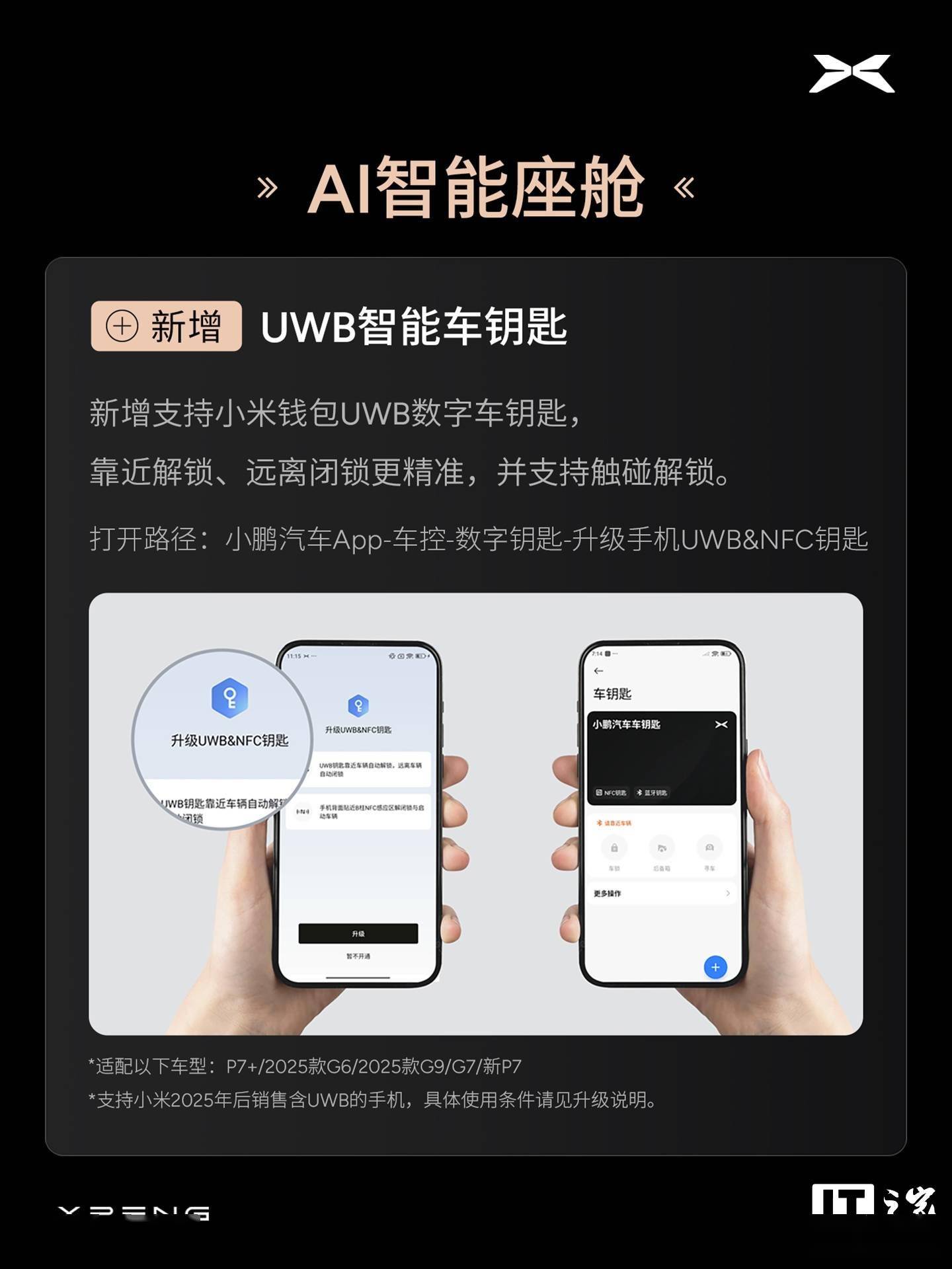 - 新增 UWB 智能车钥匙:新增支持小米钱包 UWB 数字车钥匙,靠近解锁、远离闭锁更精准,并支持触碰解锁。打开路径:小鹏汽车 App-车控-数字钥匙-升级手机 UWB & NFC 钥匙。适配以下车型:P7+ / 2025 款 G6 / 2025 款 G9 / G7 / 新 P7。支持小米 2025 年后销售含 UWB 的手机,具体使用条件请见升级说明。