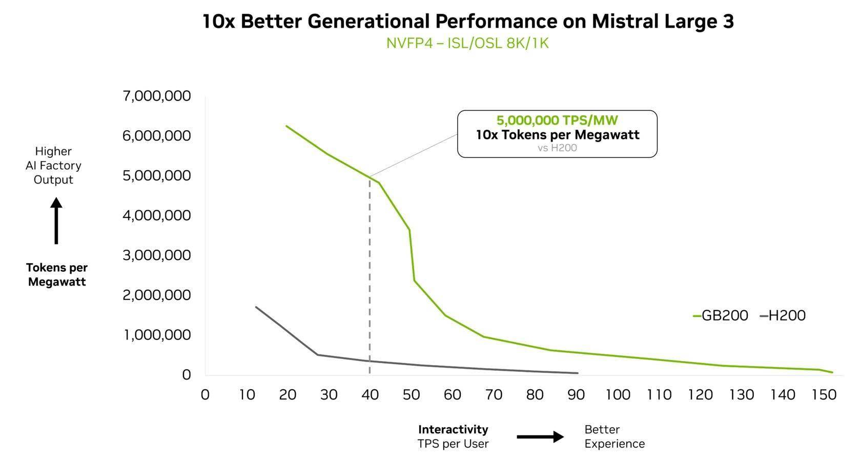基于开源大语言模型 Kimi K2 Thinking、Deepseek-R1-0528、Mistral Large 3 测试,相比上一代 Hopper HGX 200 性能提升 10 倍。