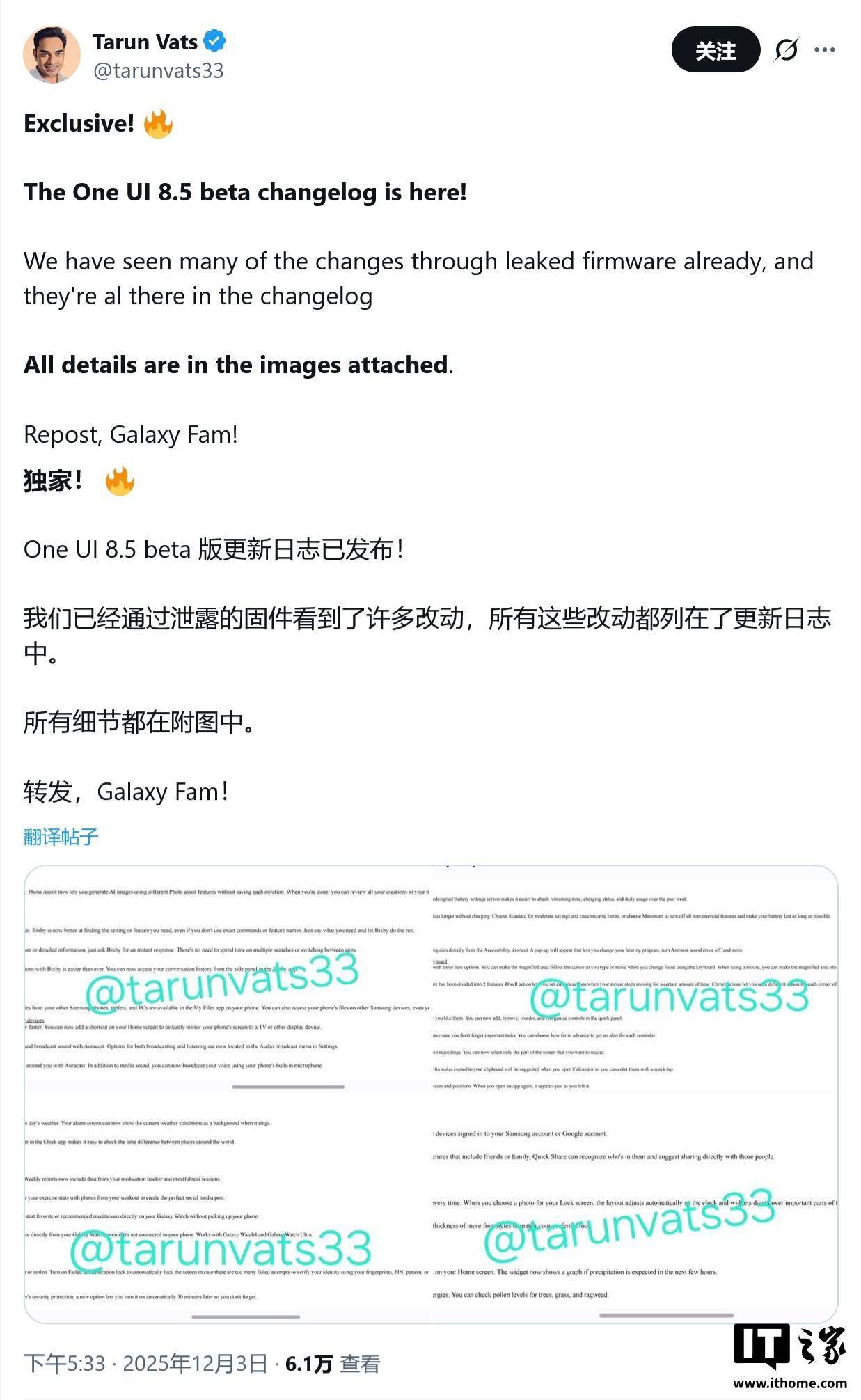 tarunvats33 昨日(12 月 3 日)在 X 平台发布推文,分享了一组截图,展示了 One UI 8.5 测试版完整更新日志,预示着三星将于 12 月开启系统测试。 科技媒体 Wccftech 解读认为,One UI 8.5 是一次全面的功能升级,进一步完善三星设备生态,重点围绕人工智能、跨设备连接和个性化体验三个方面优化。 在 AI 方面,One UI 8.5 主要增强了 Galaxy AI 的照片助手功能,让用户在编辑过程中创建多个 AI 生成的图像版本,无需频繁保存,随时调取历史记录,从而选择最满意的效果。 IT之家援引博文介绍,新版增强了语音助手 Bixby 的智能体验,提升其上下文理解能力,即使用户的语音指令不够精确,也能准确找到目标设置或功能,并且支持查询历史对话记录。 在设备互联互通方面,One UI 8.5 新增的“共享存储”,支持用户通过“我的文件”应用,在其他三星手机、平板电脑和个人电脑上直接访问本机文件。 新版简化智能视图(Smart View)功能,用户可在主屏幕创建快捷方式,实现一键投屏。此外,新系统还支持 Auracast 音频广播技术,可将设备的声音分享给附近的其他人。 个性化与日常使用体验方面,One UI 8.5 重新设计电池设置界面,可以更清晰地展示剩余电量、充电状态和日常用量。此外新版为快速面板、锁屏时钟字体提供了更丰富的自定义选项。 针对特定的人像或宠物锁屏壁纸,系统还会自动调整时钟和组件的位置,避免遮挡画面主体。此外,闹钟、计算器、天气等原生应用也获得了功能增强和界面优化。 三星健康应用新增了更详细的周报,并允许用户分享带有锻炼照片的运动数据。值得注意的是,Galaxy Watch 8 和 Galaxy Watch Ultra 将支持独立测量抗氧化水平,无需连接手机即可完成检测。 安全方面,One UI 8.5 进一步保障用户隐私,增加了“身份验证失败锁定”功能,在多次尝试解锁失败后将锁定设备。