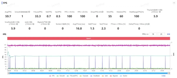 视频录制方面,我们也做了个 4K 60 帧的 30 分钟录像测试,全程平均帧率 58.82 帧,比前两年用骁龙 8Gen3 的安卓旗舰还要好很多,表现相当稳定。