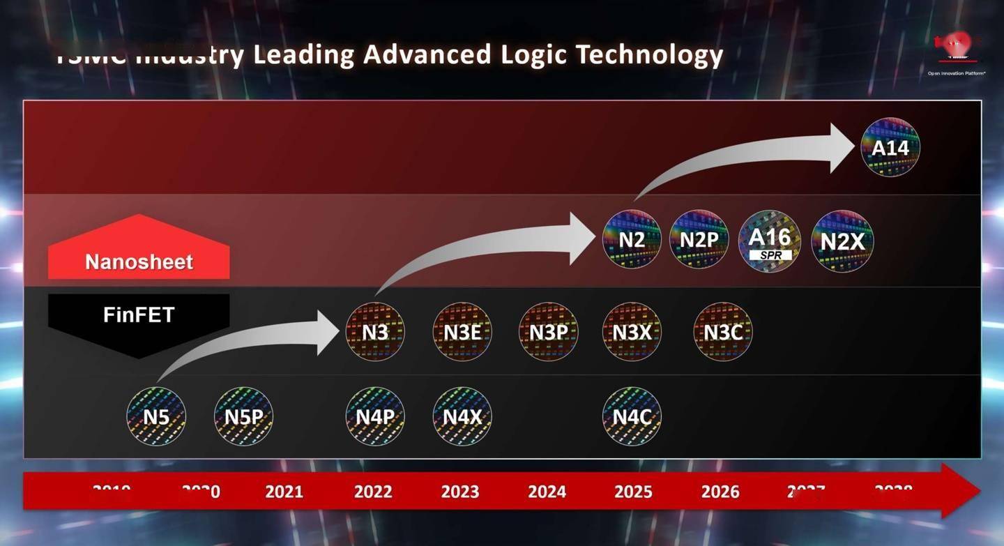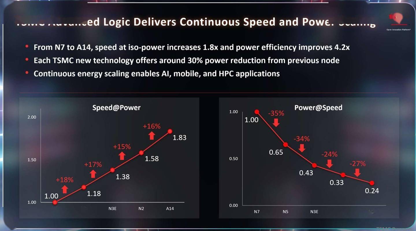 台积电在上月举行的 2025 年 OIP 生态系统论坛欧洲场上表示,从 2018 年的 N7 到 2028 年的 A14,十年间该企业的先进制程将可在同等速度(性能)下降低 76% 的功耗,能效接近此前的 4.2 倍,每个主要节点间的功耗降低比例在三成上下。 台积电还提到,如以相同的功耗,A14 工艺芯片的速度将可达到 N7 制程版本的 1.83 倍。该企业通过工艺在能效侧的改进不断为 AI、移动、HPC 应用赋能。 IT之家注意到,台积电在 3nm 系节点上使用的基准是 N3E 而非更早一些的 N3B。