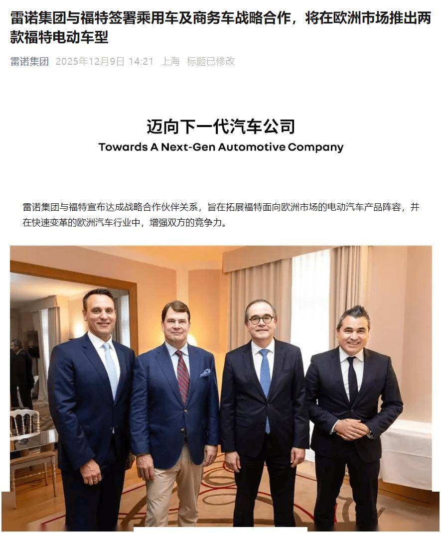 雷诺集团与福特今日宣布达成战略合作伙伴关系,旨在拓展福特面向欧洲市场的电动汽车产品阵容,并在快速变革的欧洲汽车行业中,增强双方的竞争力。 双方签署了有关两款全新福特品牌电动车型的合作协议,新车型将基于安培平台打造,并在安培电动汽车城(ElectriCity)投产。 两款全新车型将由福特主导设计,与雷诺集团共同开发。IT之家从合作公告获悉,新车型承袭福特品牌基因,伴随着首款车型于 2028 年初抵达展厅,福特将在欧洲市场开启全新的产品攻势。 除电动汽车合作外,雷诺集团还与福特签署了一份关于欧洲轻型商用车型合作的意向书。根据该意向书,双方将共同探索联合开发与生产雷诺及福特品牌旗下特定轻型商用车型的可能性。