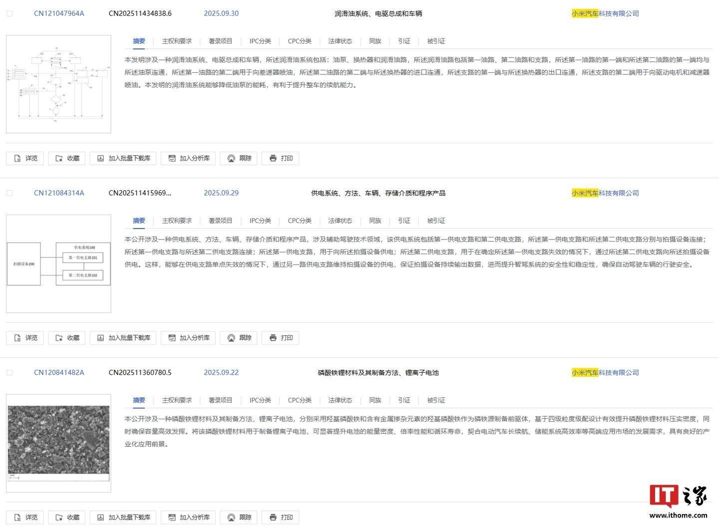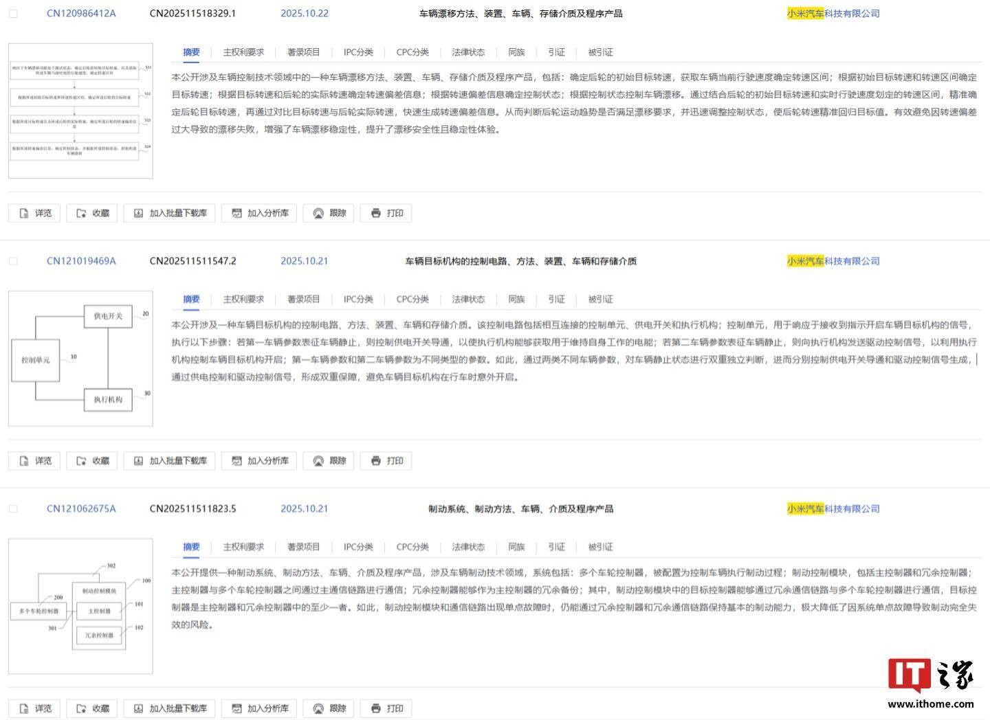 IT之家注意到,小米还公布了多项汽车专利,覆盖车钥匙控制、车辆漂移控制、磷酸铁锂材料及其制备方法等。 值得一提的是,小米三款新车已曝光,包括大型增程 SUV(可能被命名“YU9”)、SU7 衍生车型(可能命名“SU7L”)、高性能 SUV(可能命名“YU7 GT”)。