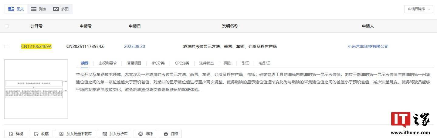 国家知识产权局显示,小米汽车科技有限公司在 12 月 5 日公开了一项“燃油的液位显示方法、装置、车辆、介质及程序产品”发明专利,而液位显示专利是其燃油 / 混动技术储备的组成部分,这意味着小米汽车或给混动车型的体验优化铺路。 本公开涉及车辆技术领域,尤其涉及一种燃油的液位显示方法、装置、车辆、介质及程序产品,包括:确定交通工具的油箱内燃油的第一显示液位值,响应于燃油的第一显示液位值与燃油的第一采集液位值之间的第一液位差值大于预设差值,对燃油的显示液位值进行至少两次调整,使得燃油的显示液位值逐渐变化为与燃油的采集液位值之间的差值小于预设差值,减少油量跳变,使得驾驶员能够平稳的观察燃油液位变化,避免燃油液位跳变影响驾驶员的驾驶体验。