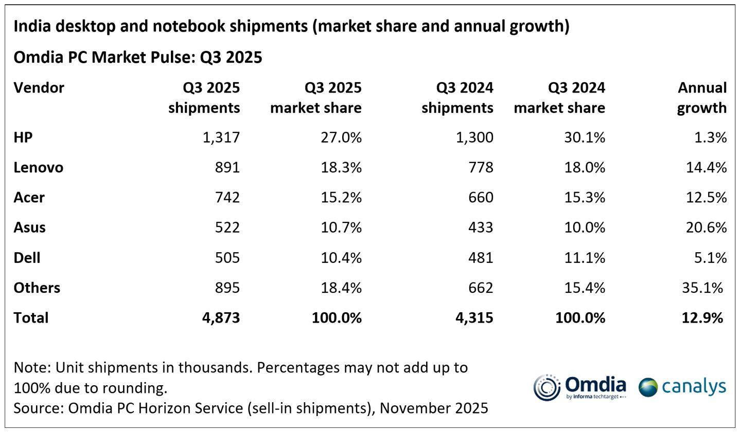 市场调查机构 Omdia 昨日(12 月 10 日)发布博文,报道称 2025 年第 3 季度印度 PC 市场(不含平板)创下历史新高,总出货量达 490 万台,同比增长 13%。 其中笔记本电脑出货量攀升至 400 万台,同比增长 12%;台式机出货量则劲增 18%,达到 92 万台。分析师指出,这一显著增长主要归因于厂商为迎接节日旺季而加速备货,以及针对商业客户的稳定交付能力。 消费级 PC 市场在本季度表现尤为亮眼,录得 20% 的同比增长。主要电商平台的早期促销活动带动了强劲的线上销量,线下零售渠道随后跟进,通过折扣和现金返还活动维持了增长势头。 值得注意的是,高端笔记本电脑出货量大涨 27%。这表明,随着高规格机型的普及和促销力度的加大,消费者更倾向于购买性能更强的设备。Omdia 高级分析师 Ashweej Aithal 表示,消费者的高涨热情与企业的稳健执行共同造就了这一强劲季度。 商用 PC 市场实现了 7% 的同比增长,主要得益于大型企业按计划执行设备更新周期。然而,中小企业(SMB)因担忧内存和显示器等组件成本上涨,表现相对谨慎。 细分到品牌方面,IT之家附上 2025 年第 3 季度情况如下: - 惠普出货量为 131.7 万台,市场占有率 27%,同比增长 1.3%;