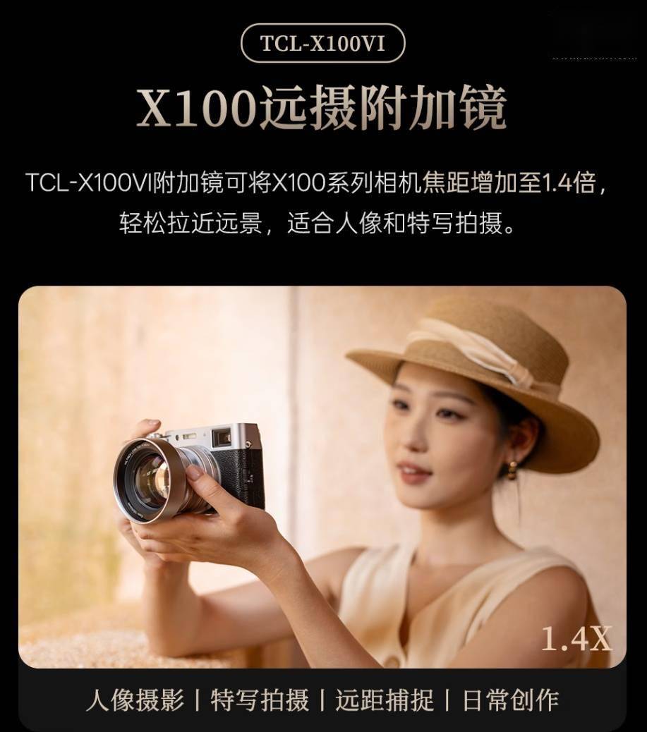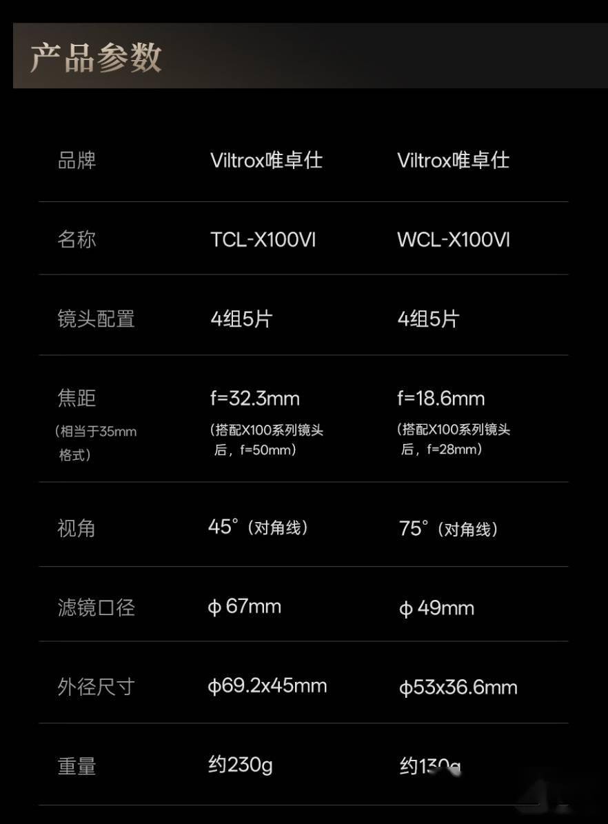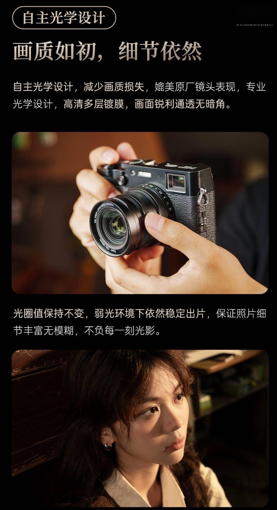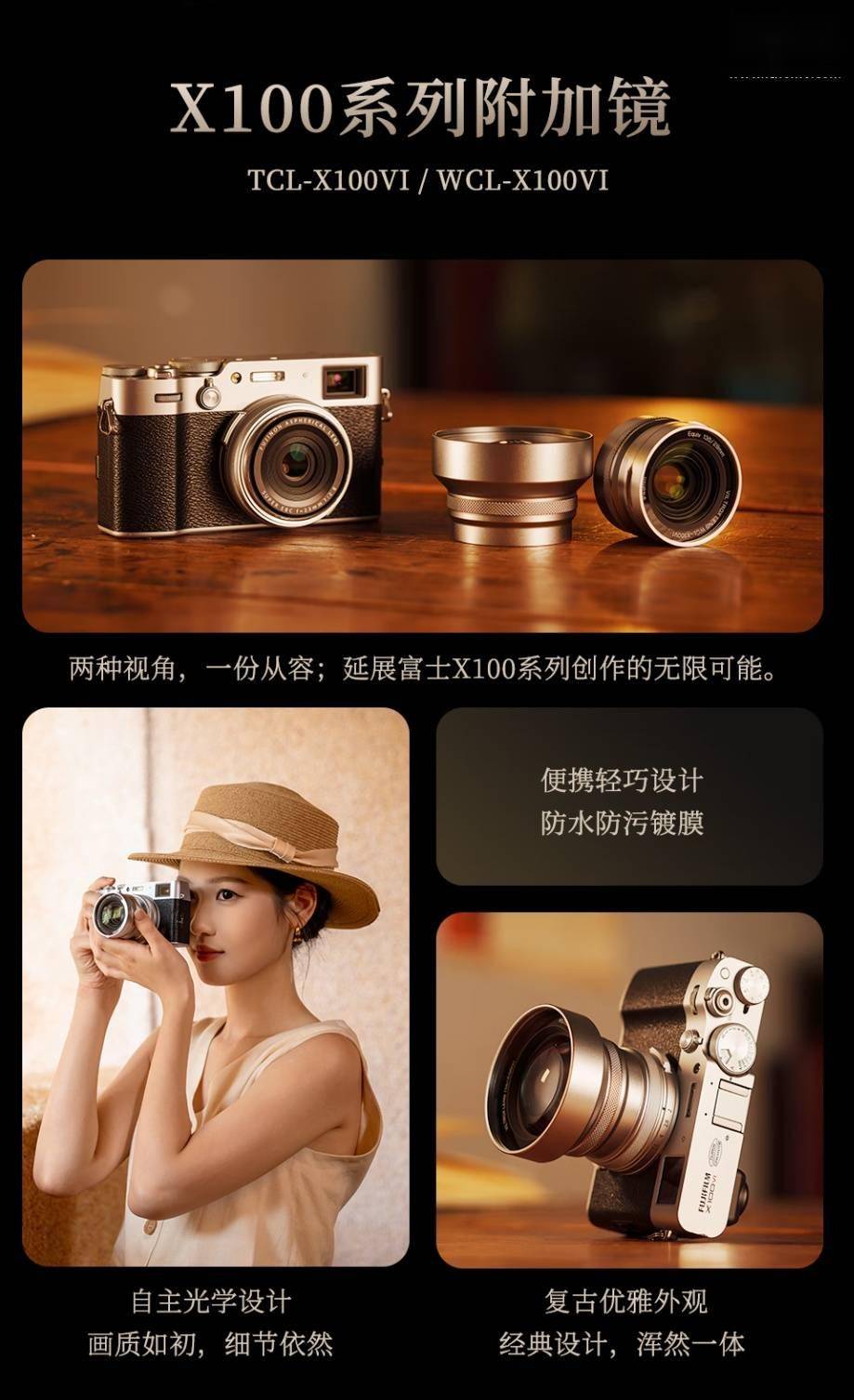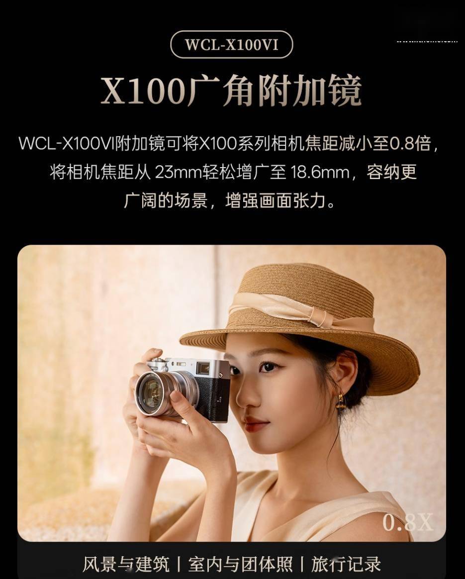 IT之家 12 月 13 日消息,唯卓仕现已推出 WCL-X100VI 广角附加镜,售价 709 元,适配富士 X100 系列半画幅固定镜头相机,可将原镜头的 23mm 焦距增广至 18.6mm,容纳更广阔的场景。 据介绍,这款附加镜兼容富士 X100、X100S、X100F、X100V 和 X100VI 相机,拥有黑色、银色两种配色,采用前置附加的形式,通过螺纹接口安装在到相机镜头前,采用自主光学设计,内置多层镀膜,可减少画质损失,号称“媲美原厂镜头”。 该产品可将原镜头的焦距缩小至 0.8 倍,经过半画幅 1.5 倍换算后,可将原本的 35mm 焦距增广至 28mm 左右,拓宽视野,在狭窄空间内容纳更多事物,还能够让旅行 Vlog 或街拍更加生动。 此外,这款附加镜在装上后光圈数值保持不变,还可在机内菜单智能同步焦段,自动优化畸变、暗角等。 IT之家附该镜头详细参数如下: 目前该镜头已在京东平台开售,价格 709 元。