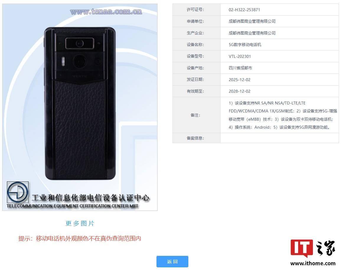 型号为VTL-202301 的 Vertu 纬图新机已通过电信设备进网许可,并公布了证件照。从图片来看,新机采用皮质拼接机身 + 红色按键设计。 相关页面显示,新机支持 NR SA / NR NSA / TD-LTE / LTE FDD / WCDMA / CDMA 1X / GSM 制式、5G-增强移动宽带(eMBB)技术、5G 异网漫游功能等。 IT之家从电信设备终端网获悉,Vertu 纬图 VTL-202301 新机配备 5000mAh 电池、预装安卓系统,支持 USB、蓝牙、红外连接;支持 VoNR、voLTE、语音回落到 WCDMA、语音回落到 GSM 等。 值得一提的是,今年 10 月,Vertu 纬图在伦敦哈罗德百货正式发布全新旗舰手机 Agent Q,这款手机配备 6.02 英寸 AMOLED 屏幕,分辨率 1080×2340,刷新率 120Hz,搭载骁龙 8 至尊版芯片,内存 16GB,可选 512GB 或 1TB 存储,内置 5565mAh 电池并支持 65W 有线快充。