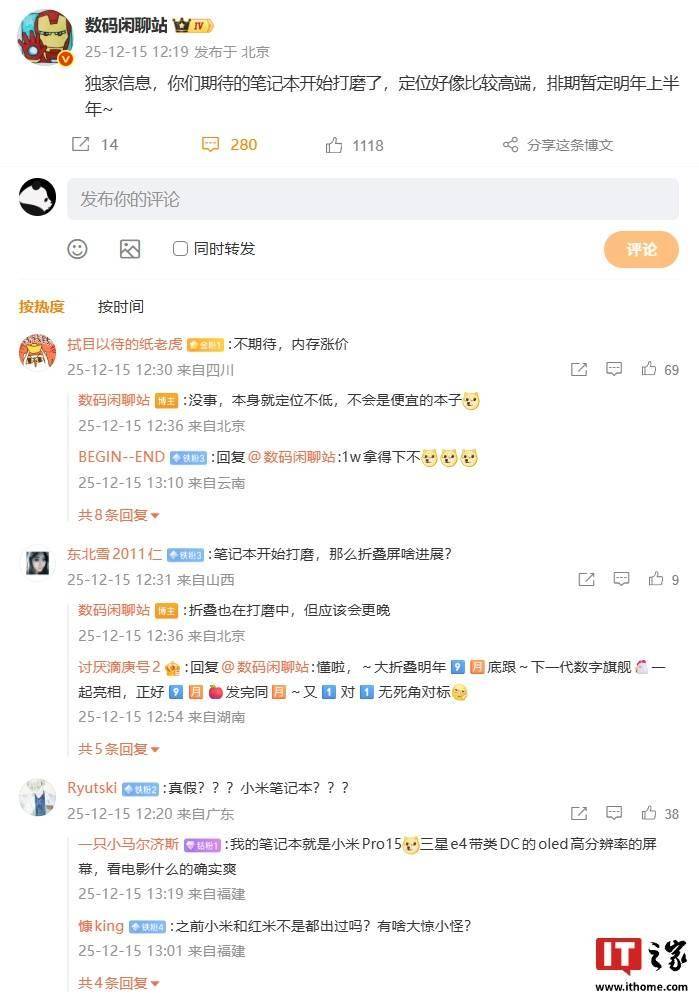 数码闲聊站 今日发文透露,某厂高端定位笔记本开始打磨,排期暂定明年上半年。结合评论区讨论来看,该款高端笔记本预计归属小米品牌。 有网友表示:“不期待,内存涨价。”博主回复:“没事,本身就定位不低,不会是便宜的本子。”还有网友询问:“笔记本开始打磨,那么折叠屏啥进展?”博主表示:“折叠也在打磨中,但应该会更晚。” 据IT之家此前报道,在去年 12 月,有网友在小米集团公关部总经理王化的微博评论区提问:“小米是不是最近两年都没有笔记本的计划了啊?”随后,王化在其微博评论区回应表示:“是啊,卢总说过笔记本电脑这方面 REDMI 做好了,我们再考虑小米笔记本电脑。”