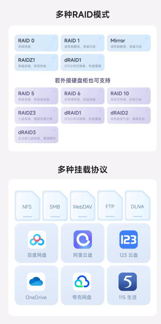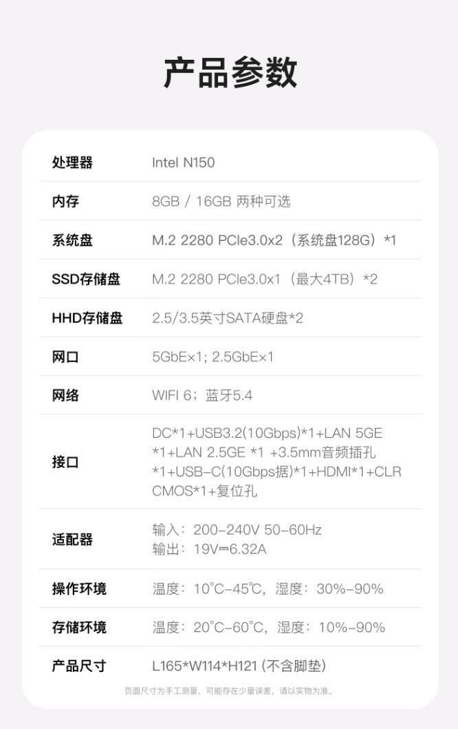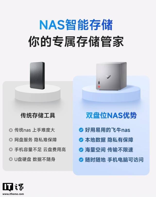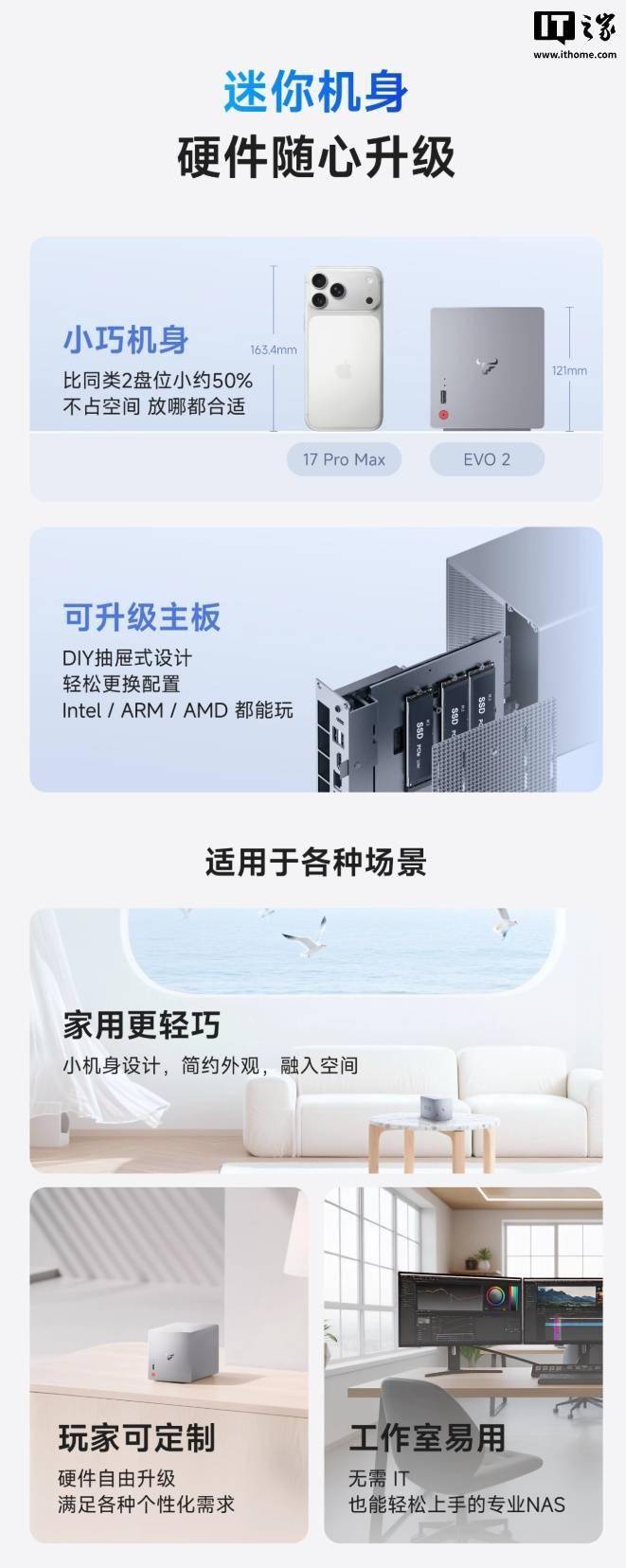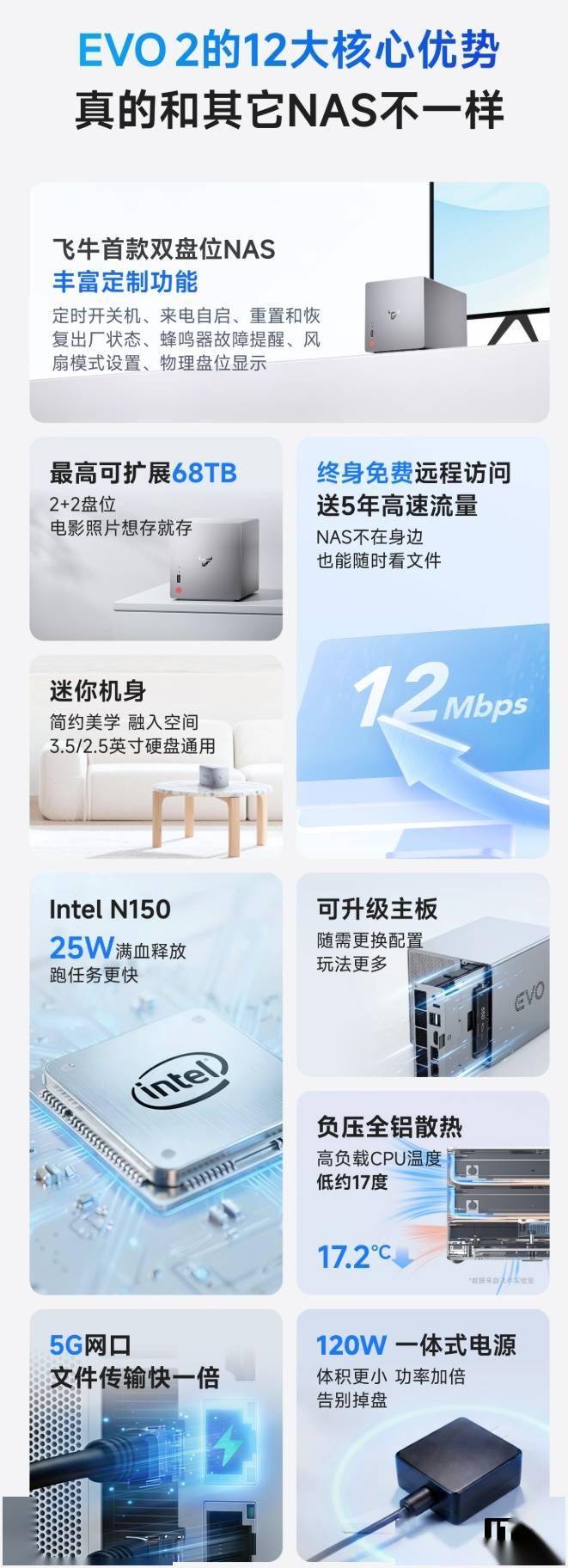 IT之家 12 月 15 日消息,飞牛首款自有 NAS EVO 2 现已在天猫平台开启预售,采用双盘位设计,支持安装 2.5/3.5 英寸机械硬盘,拥有 128GB NVMe 系统盘,最高可扩容至 68TB,售价 1999 元起。 据介绍,这款 NAS 搭载英特尔 N150 四核 CPU,最高睿频可达 3.6GHz,性能释放可达 25W,支持解码 AVC、HEVC、VP9 等视频编码,可选 8GB 和 16GB 内存,主板采用抽屉式推拉设计,可随时升级 / 更换英特尔 / AMD / ARM 平台。 设计方面,这款 NAS 的机身较为小巧,高 121mm,相比同类产品小 50%,支持 Btrfs、ext4、ZFS 等文件系统,可使用 RAID 0/1/mirror/ RAIDZ1/dRAID 1 等冗余备份,外接硬盘柜后还可支持 RAID 5/6/10/Z3/dRAID 1/dRAID 2/dRAID 3 等。 此外,这款 NAS 搭载 fnOS,支持 NFS、SMB、WebDav 等挂载协议,拥有应用商店,可随意安装百款 App,内置虚拟机功能,支持一机多用,自带终身免费远程访问服务,随机附赠 5 年 12mbps 高速流量,价值 495 元。 特色功能方面,这款 NAS 支持本地 AI 相册、影视娱乐中心,可自动刮削影音文件,满足多端同步需求,还可以无缝同步 PC 与 Mac 的文件,支持安装百度网盘、迅雷、Aria 2、Qbittorrent 等下载工具,兼容 Docker 生态。 IT之家附该产品详细参数如下: 目前该产品已在天猫开启预售,价格 1999 元起。